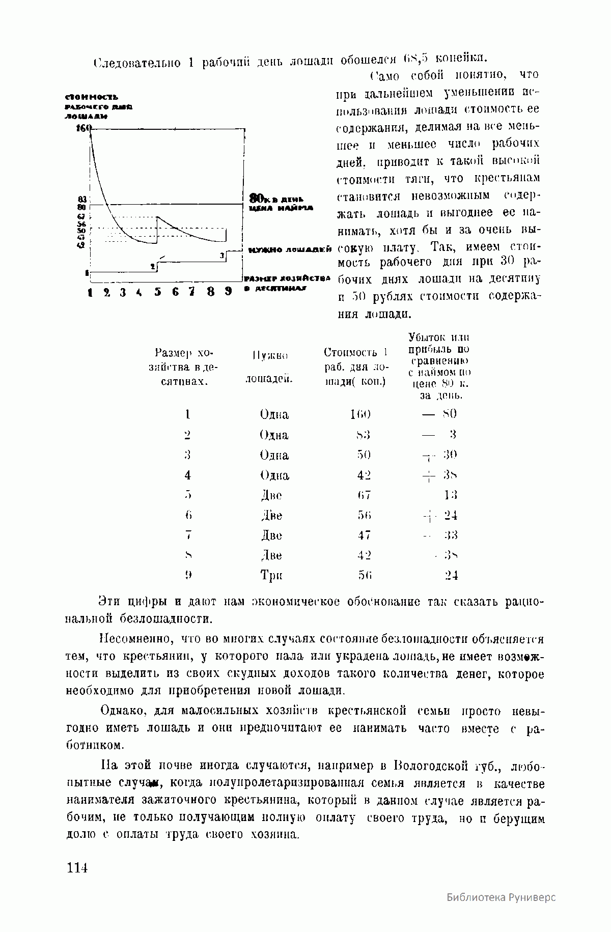 Диаграмма стоимости рабочего дня лошади для хозяйств разного размера.