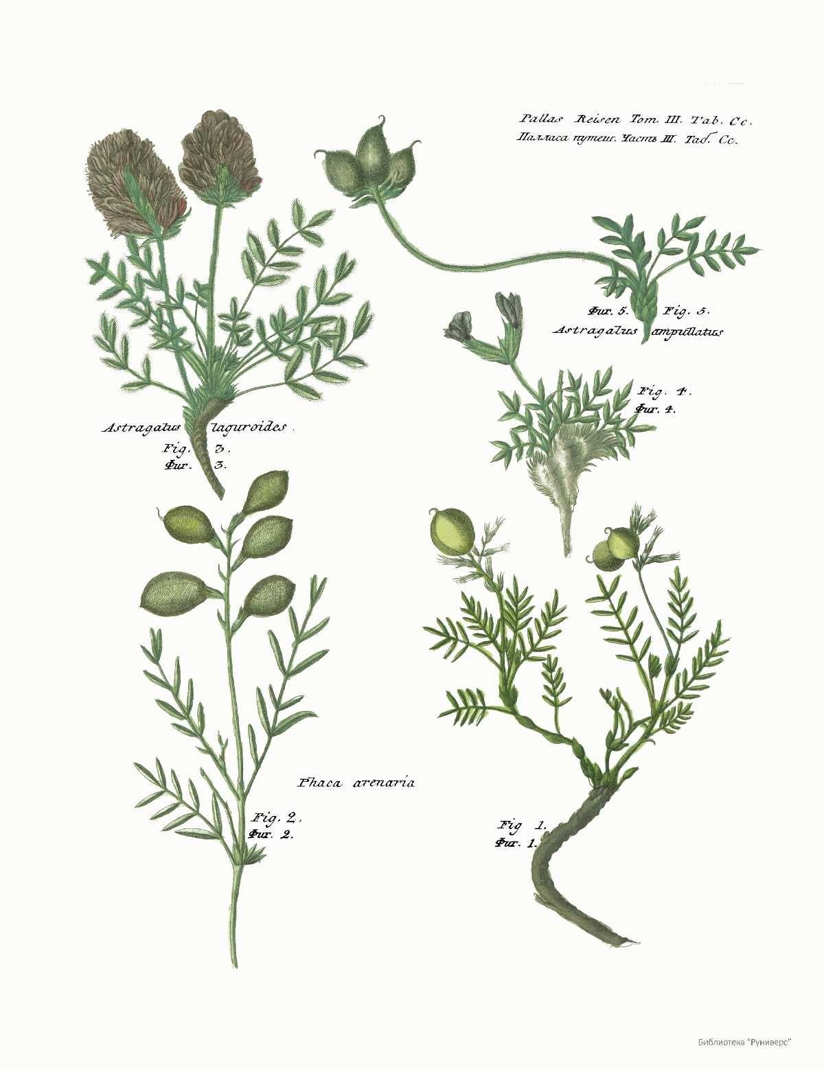 Том III. Таб.Cc. Phaca arenaria. Astragalus laguroides. Astragalus ampullatus.