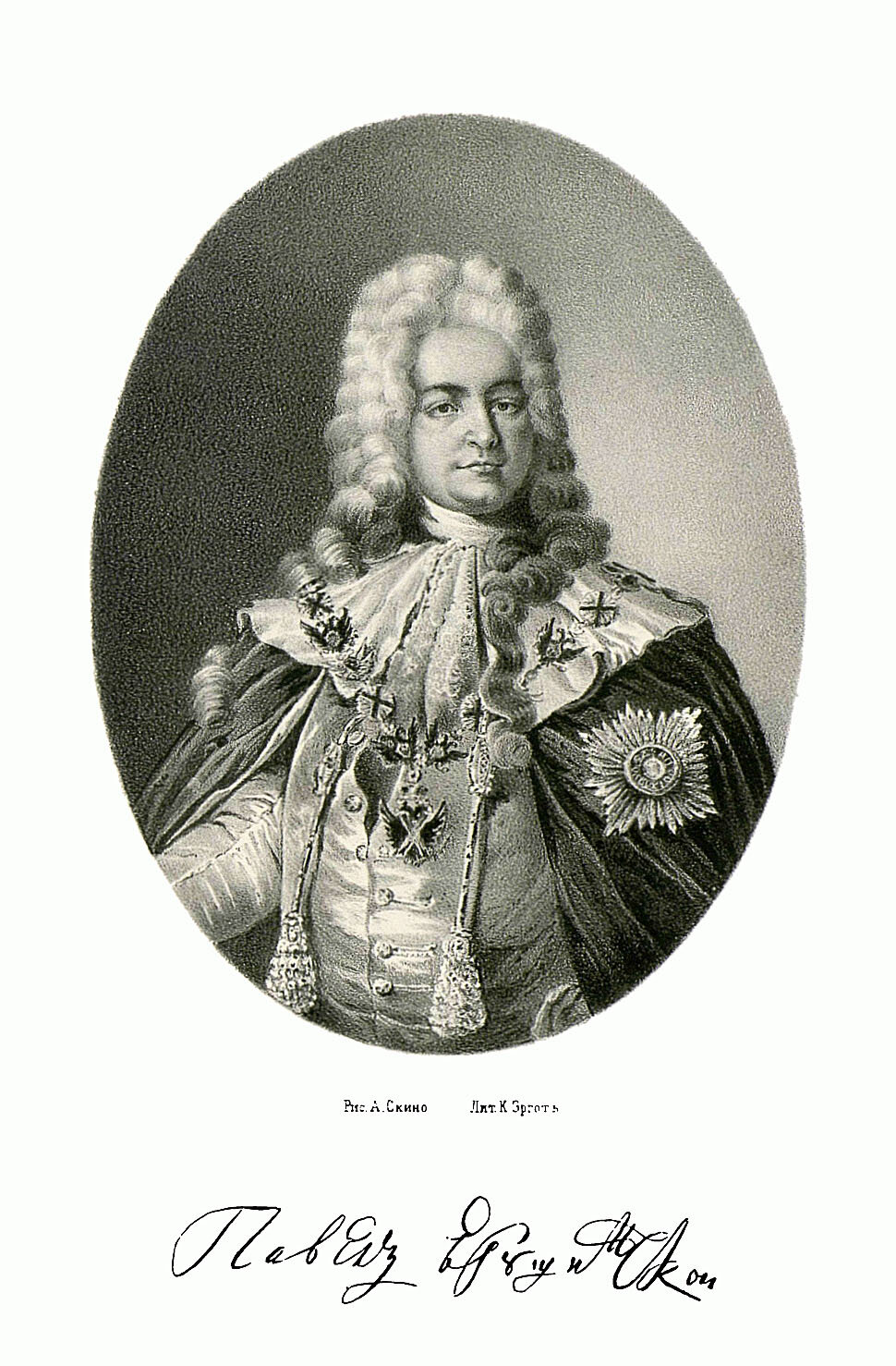 Ягужинский (Ягушинский) Павел Иванович [1683 — 6(17).4.1736, Петербург], русский государственный деятель и дипломат, сподвижник Петра I, граф (с 1731). Сын органиста, выходца из Литвы. С 1701 служил в гвардии, состоял при Петре I, выполнял дипломатические поручения. В 1719 участник Аландского конгресса, в 1720—21 посланник в Вене. В 1722—26 и 1730—31 генерал-прокурор Сената, боролся с казнокрадством и другими должностными преступлениями. В 1726— 1727 полномочный министра при польском сейме в Гродно. В 1730 участвовал в заговоре «верховников», однако позднее известил о нём императрицу Анну Ивановну и дал ей совет отречься от «кондиций», ограничивавших её власть. В 1731—34 посол в Берлине, с 1735 кабинет-министр.