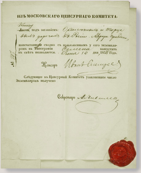 Разрешение Московского цензурного комитета от 10 июня 1838 г. на выпуск книги А. Правдина "О железных и торцовых дорогах в России".