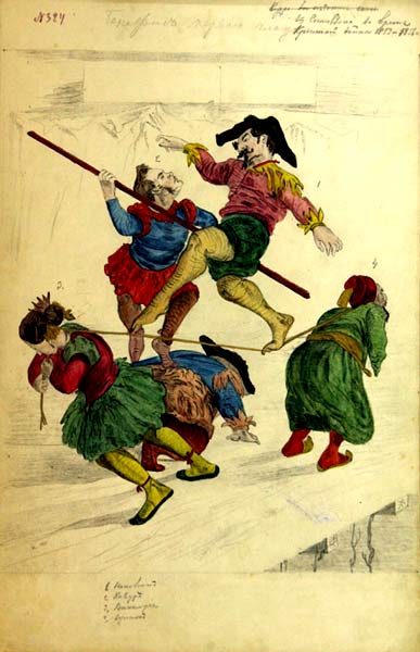 Бенефис первого клоуна. Карикатура неизвестного автора на глав союзных государств. Не ранее 14 января 1855 года. Российский государственный военно-исторический архив