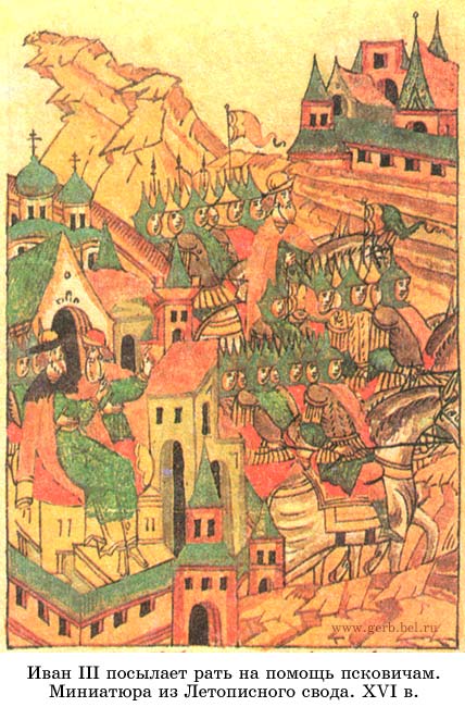 Иван III посылает рать на помощь псковичам. Миниатюра из Летописного свода. XVI век
