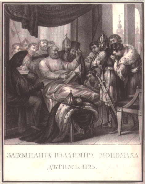 Завещание Владимира Мономаха детям, 1125 год. Литография по рисунку художника Бориса Чорикова. 1836 год