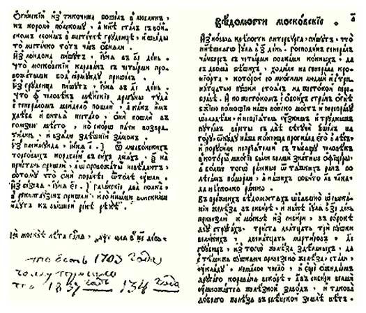 1703 год. 13 января (2 января ст.ст.)выходит первый номер первой печатной русской газеты «Ведомости»