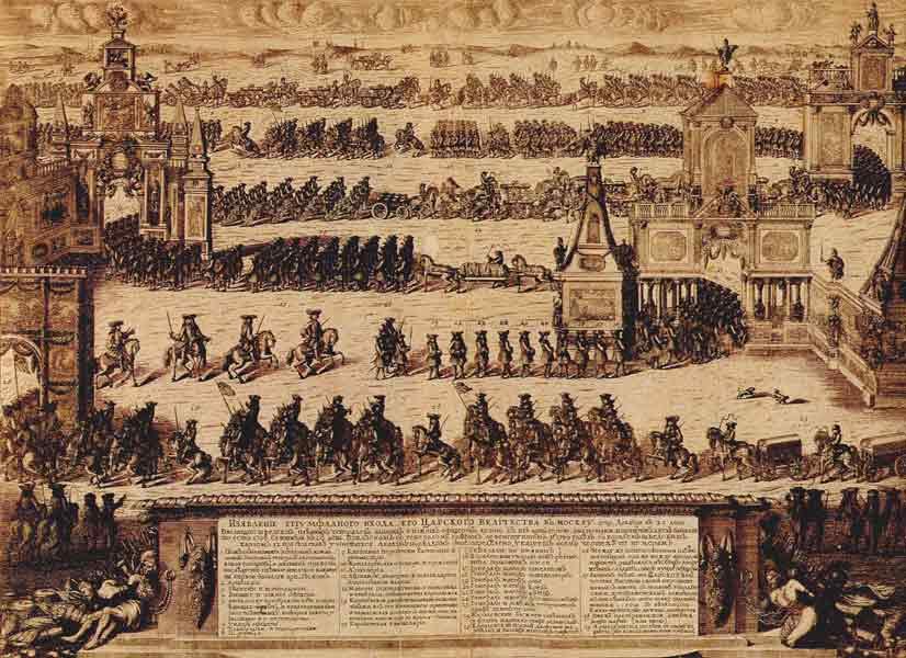 Торжественное вступление русских войск в Москву после Полтавской победы. 21 декабря 1709. Гравюра А. Зубова. 1711 год. Государственный Исторический музей, Москва