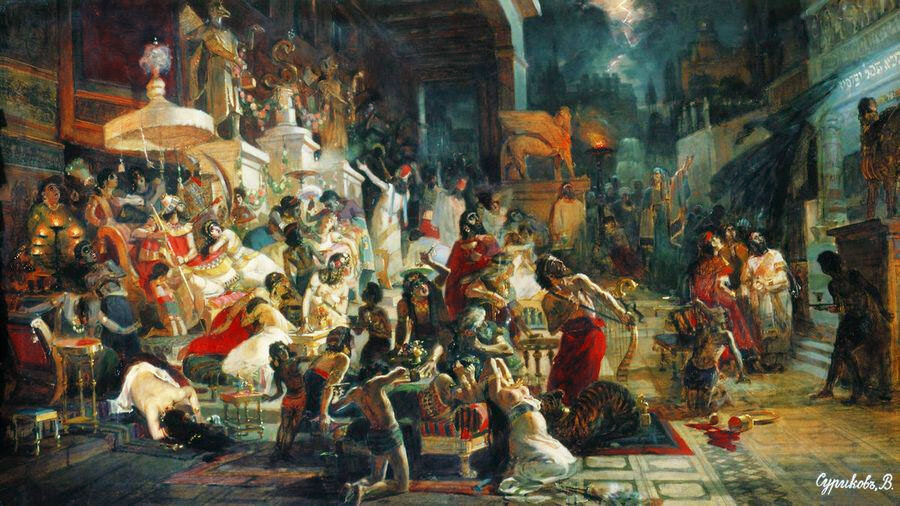 Несмотря на осаду столицы, предпринятую Киром, царь и все жители, имея у себя богатый запас продуктов, могли беспечно предаваться удовольствиям жизни. По случаю одного праздника, читаем мы в Библии, В. устроил великолепный пир, на который приглашено было до тысячи вельмож и придворных… В самый разгар пира на стене показалась рука человеческая и медленно стала писать какие-то слова. Увидев ее, «царь изменился в лице своем, мысли его спутались, связи чресл его ослабели, и колена его от ужаса стали биться одно об другое». Призванные мудрецы не сумели прочитать и разъяснить надпись. Тогда, по совету царицы, позвали престарелого пророка Даниила, который не раз, еще при Навуходоносоре, проявлял необыкновенную мудрость, и он действительно прочитал надпись, которая на арамейском языке кратко гласила: «Мене, мене, текел, упарсин». Это означало: «Мене — исчислил Бог царство твое и положил конец ему; текел — ты взвешен и найден очень легким; упарсин — разделено царство твое и отдано мидянам и персам». «В ту же самую ночь — продолжает библейский рассказ, — Валтасар, царь халдейский, был убит» (Дан. 5, 30)