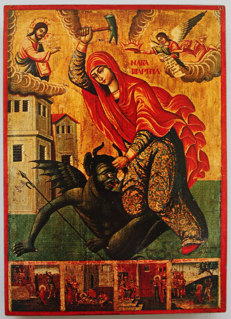 Держать святую было очень трудно, она всех держащих с силой поднимала к верху и билась жестоко; но вот пришедшая странная сделала над нею в воздухе крестные знамения и велела о. Нилу расстегнуть опоясывающий ее ремень и положить на громко и безобразно кричащую и барахтающуюся монахиню. О. Нил дрожащими руками едва расстегнул у пришедшей ремень и положил его, как было приказано, как после этого наша святая не пошевелилась и вдруг перестала кричать; только, выпуча глаза, она страшно глядела и вдруг громко и пронзительно свистнула и выпустила изо рта густой клуб дыма, странная же взяла клуб этот рукою и крестом проводила в двери вон из церкви, испуганным же зрителям и зрительницам сказала, что теперь все кончено. После этого, бывши у игуменьи за трапезой, сказала, что она пришла издалека только за тем чтобы выгнать из сестры пытливого духа, который уже больше не возвратится.