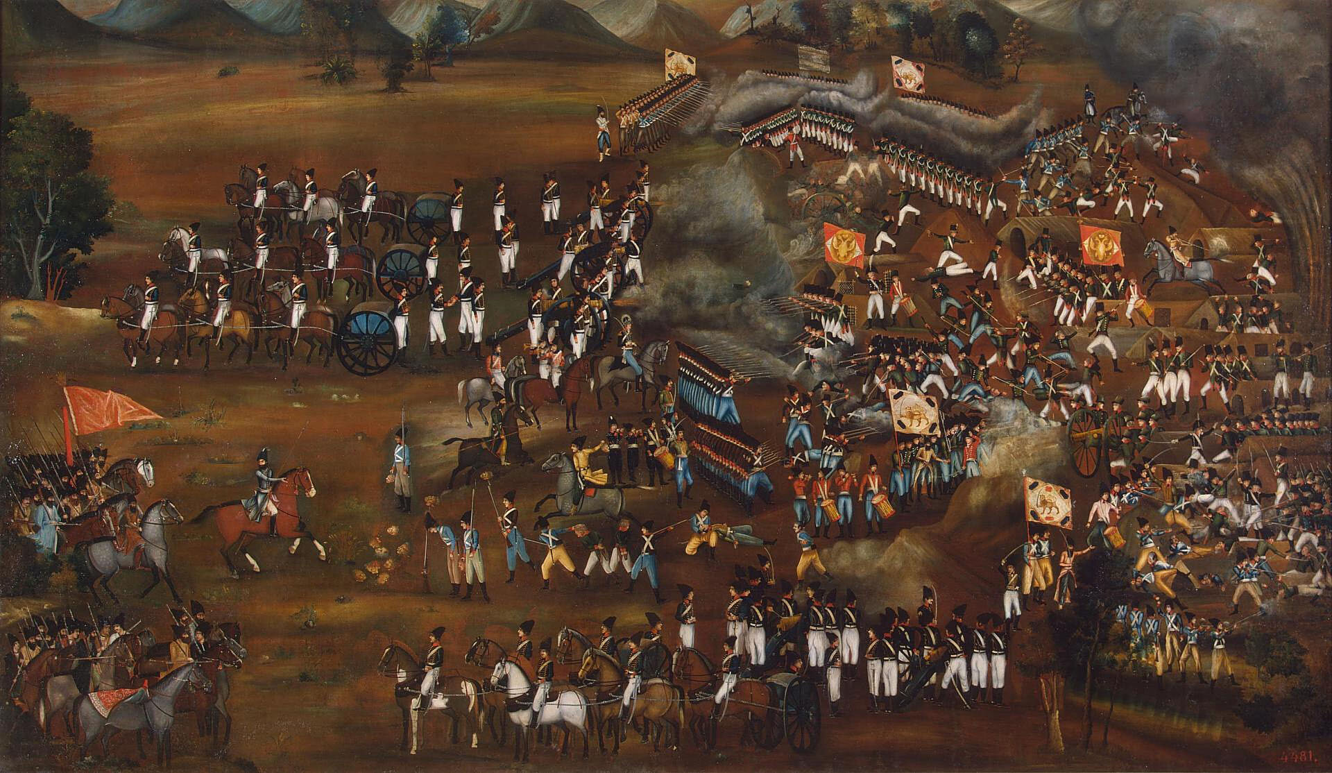 «Огромное полотно посвящено не характерному для хода русско-иранских войн эпизоду. Возможно, здесь изображено поражение русского Троицкого пехотного полка в битве при Султанабаде у реки Аракс, происшедшей 13 февраля 1812 г. В левой половине картины во главе персидских войск - сын Фатх-Али-шаха (1801-1834), наследный принц Аббас-мирза (в голубом кафтане на гнедом коне). Правой рукой он указывает на отрубленные головы врагов. Само сражение представлено в правой части композиции: бой кипит на территории русского военного лагеря. На знаменах русского полка художник неумело изобразил двуглавого орла государственного герба Российской империи. Лагерь окружен группами иранских солдат в европейских мундирах с персидскими знаменами, на которых на фоне восходящего солнца изображен лев, держащий в лапе саблю. В центре картины верхом на коне едет английский офицер - один из тех, кто реорганизовывал персидскую армию по европейскому образцу. Победе над одним русским полком придано значение большого исторического события. Полотно входило в убранство Уджанского замка Аббаса-мирзы, откуда в 1828 г. в качестве военного трофея было привезено в Зимний дворец Санкт-Петербурга».