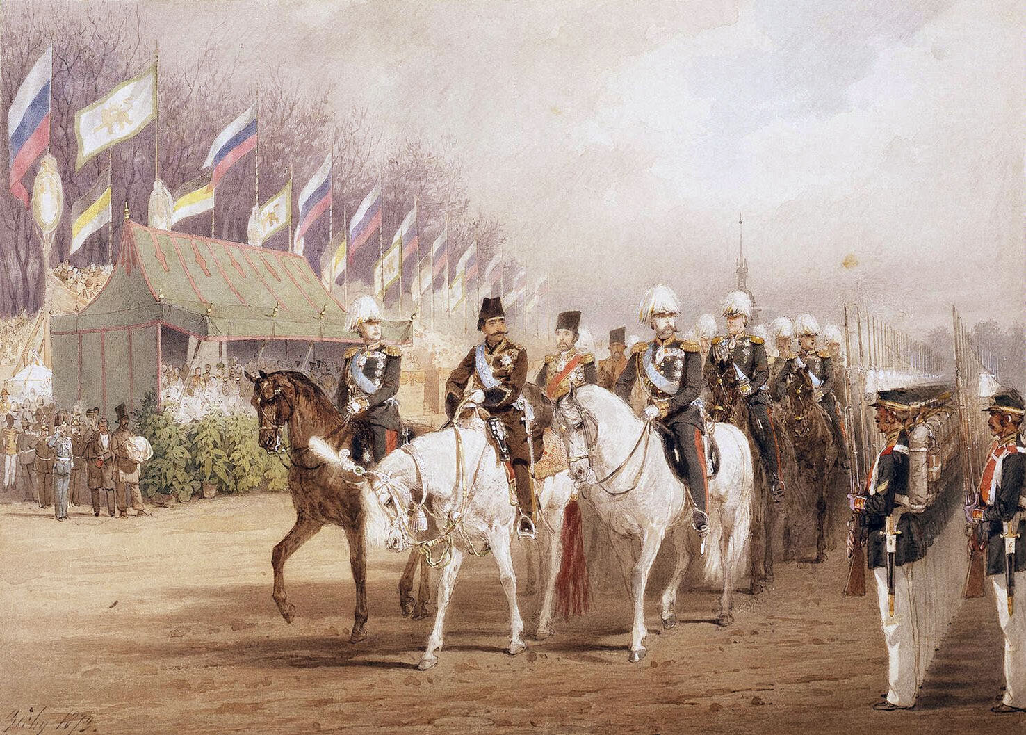Лист из серии “Посещение персидским шахом Санкт-Петербурга. 1873”.