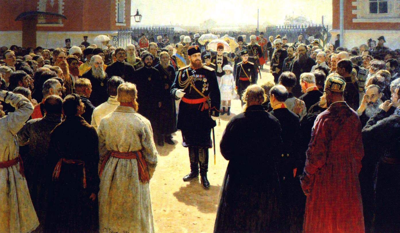 Картина исполнена по заказу Министерства Императорского двора, который был получен И.Е.Репиным летом 1884. Рама, изготовленная для картины по специальному заказу, увенчана гербом Российской империи и украшена гербами российских губерний. В картуше на раме помещен текст из речи императора: «Очень рад видеть вас; душевно благодарю за ваше сердечное участие в торжествах наших, к которым так горячо отнеслась вся Россия. Когда вы разъедетесь по домам, передайте всем мое сердечное спасибо, следуйте советам и руководству ваших предводителей дворянства и не верьте вздорным и нелепым слухам и толкам о переделах земли, даровых прирезках и тому подобному. Эти слухи распускаются нашими врагами. Всякая собственность, точно также как и ваша, должна быть неприкосновенна. Дай Бог вам счастья и здоровья».