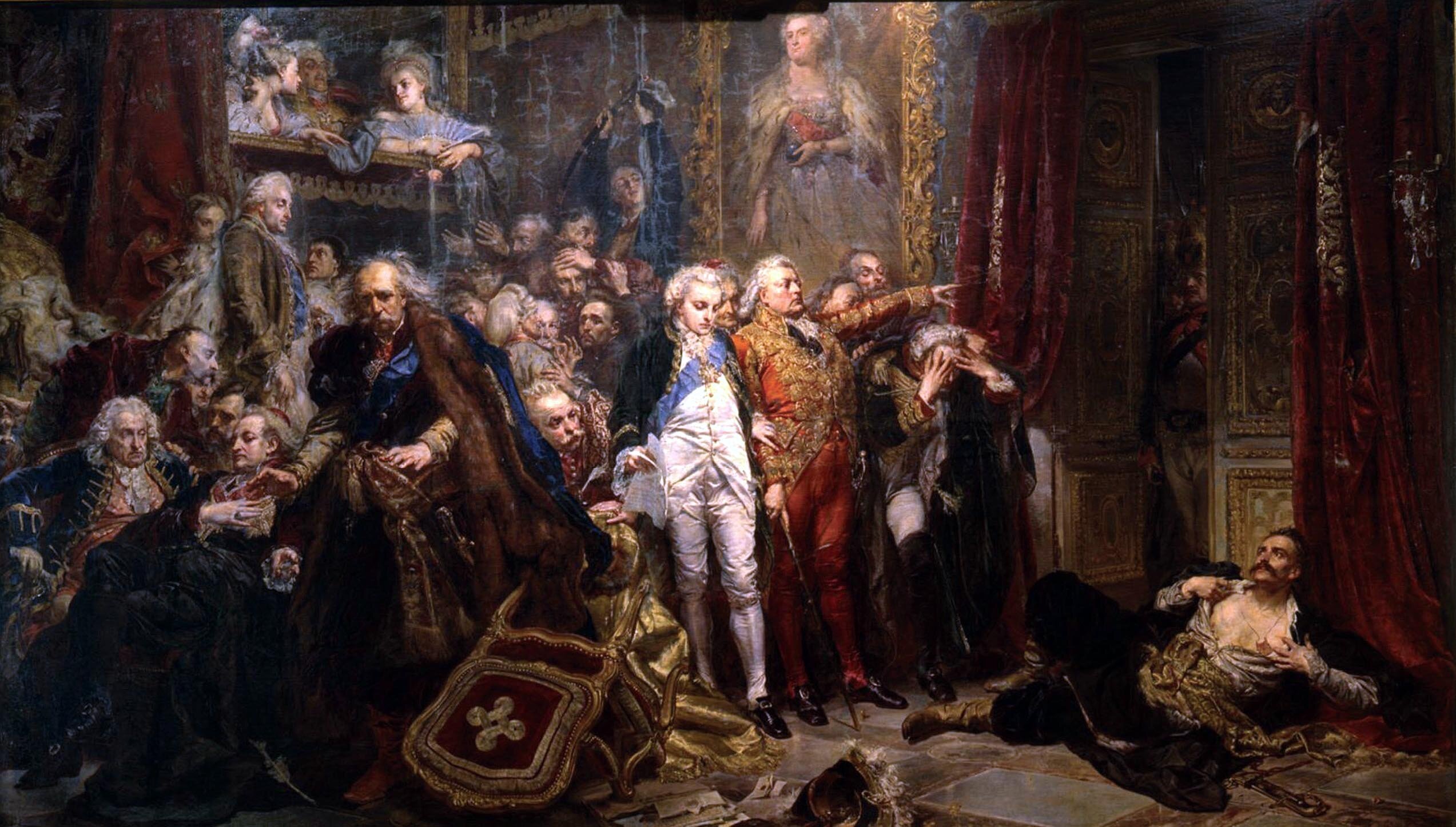 Центральной фигурой картины является шляхтич Тадеуш Рейтан, который в отчаянии пытается предотвратить позорное для его родины событие. Лежащему в дверях Рейтану Адам Понинский указывает на русских гренадеров, которые видны в зале за дверью. Слева от Понинского изображён Станислав Щенсный Потоцкий (которому в то время был 21 год и в зале сейма его не было). Справа от Понинского коронный гетман Франциск Ксаверий Браницкий, который закрыл лицо руками. Эти трое как раз собираются войти в зал сейма, чтобы подписать унизительный для Речи Посполитой договор.