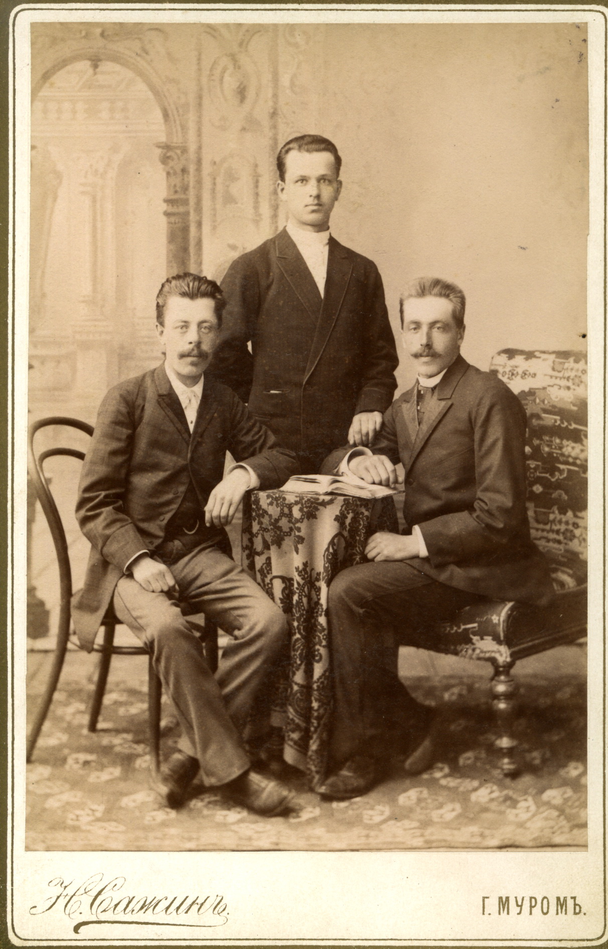 Фотоателье Н. Сажина, Муром. Нехорошев Петр Петрович (стоит) с двумя неизвестными мужчинами. 1907-1910.