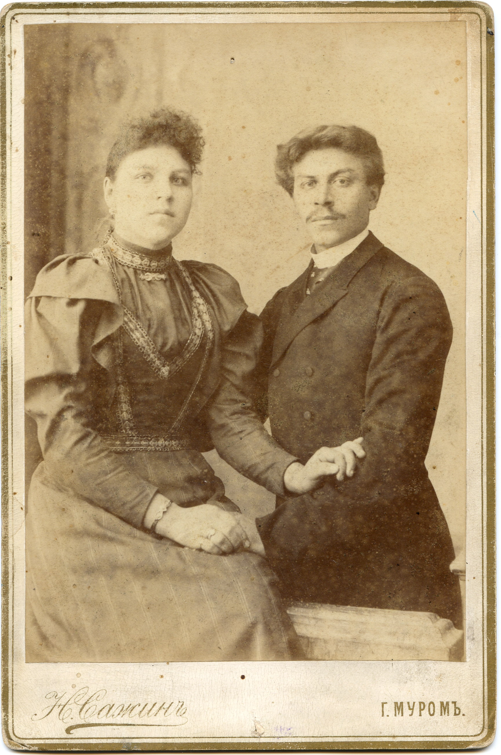 Фотоателье Н.Сажина, Муром. Портрет супругов Деевых. На обороте надпись: «пом. машиниста паровоза». 1894 г.