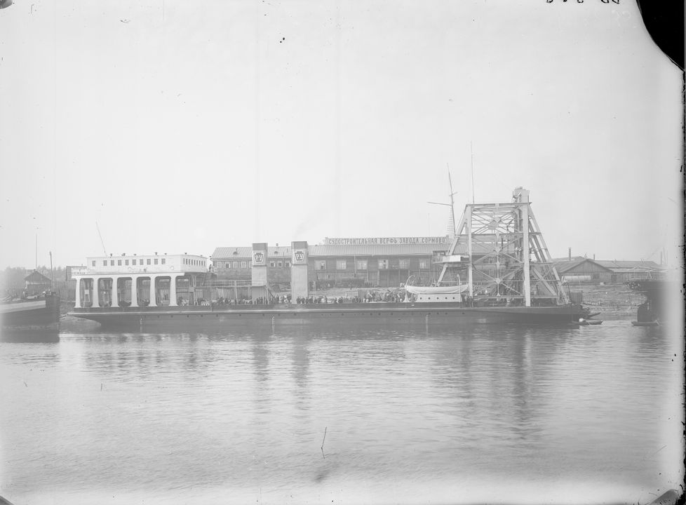 Спуск канонерских лодок на воду на реке Волге. Нижний Новгород.