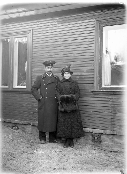 Парный портрет. Мужчина в шинели, женщина в меховом пальто с муфтой на фоне стены дома. Автор: В.А. Зевеке Место события: неизвестно Дата: 1915-1916 гг.