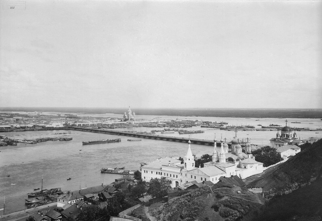 Общий вид Нижнего Новгорода с Гребешка. На переднем плане – Благовещенский монастырь, плашкоутный мост, на заднем плане – Стрелка. Дата: к. XIX в. Место съемки: г. Н.Новгород