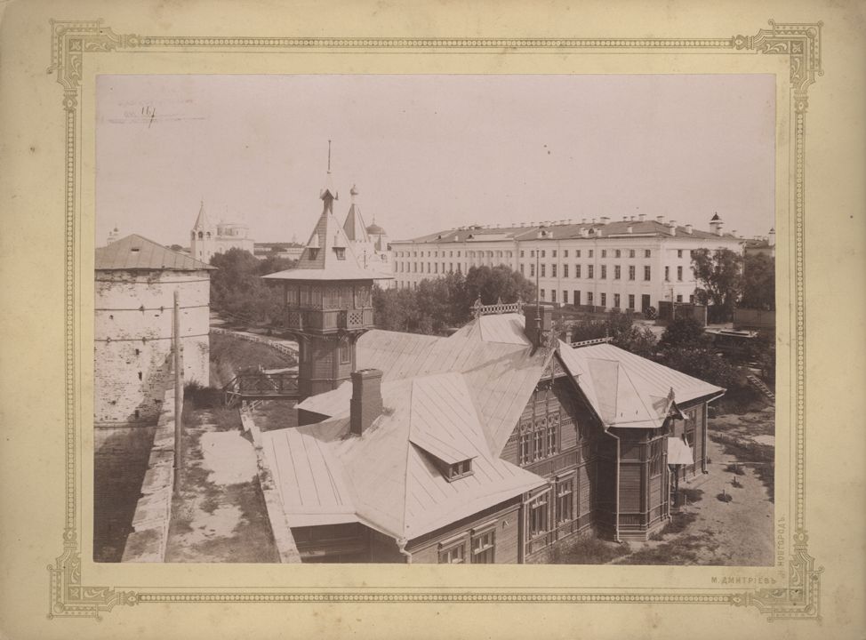 Вид на здание Кадетского корпуса – справа и кремлевский элеватор – слева. Дата: к. XIX в.Место съемки: г. Н.Новгород Автор: М.П. Дмитриев