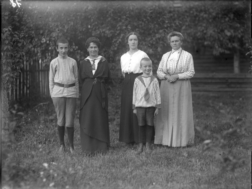Групповой портрет. Три женщины, юноша и мальчик 5-6 лет (сидят). Автор: В.А. Зевеке Место события: г. Воткинск Дата: 1915-1916 гг.