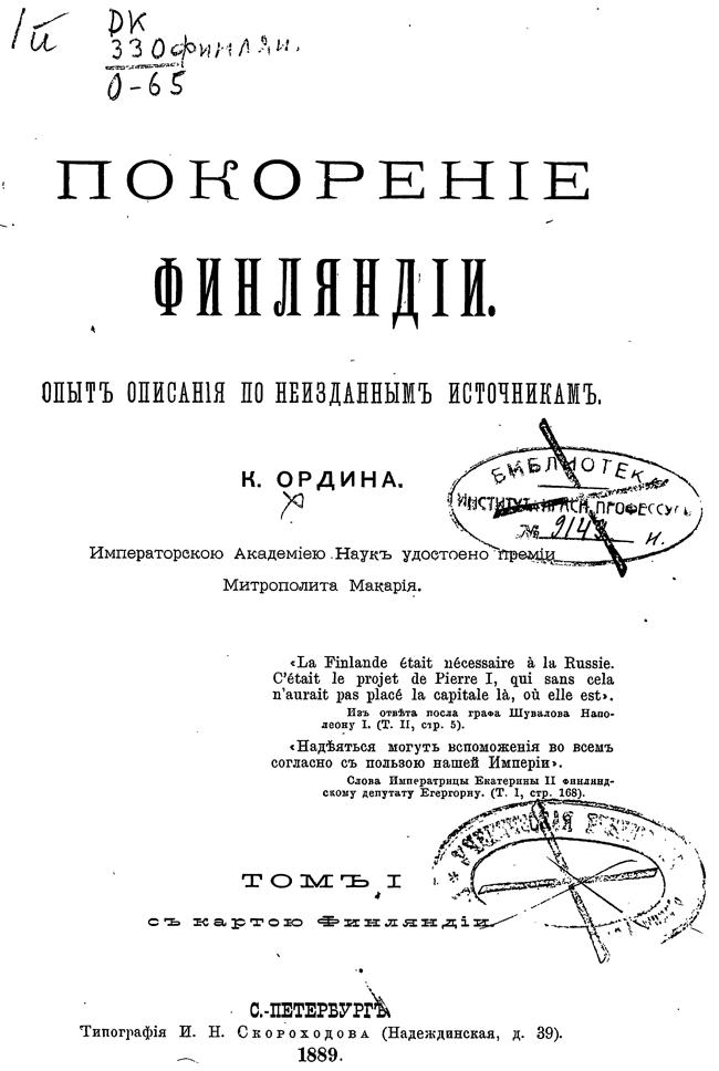 К. Ф. Ордин в 1889 году издал большое двухтомное исследование «Покорение Финляндии», в котором на основании отысканных им, большей частью ранее нигде не напечатанных источников, изложил историю покорения Финляндии русскими и утверждения в ней русской власти. Это исследование было удостоено Императорской Академией Наук премии имени митрополита Макария.