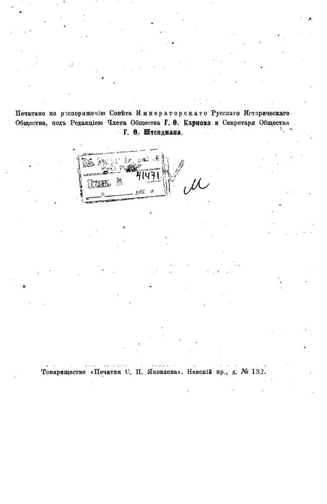 Настоящий том печатался под наблюдением действительного члена Общества Г. Ф. Карпова, а после его смерти оканчивался под наблюдением члена Общества Д. Ф. Кобеко и секретаря Общества.