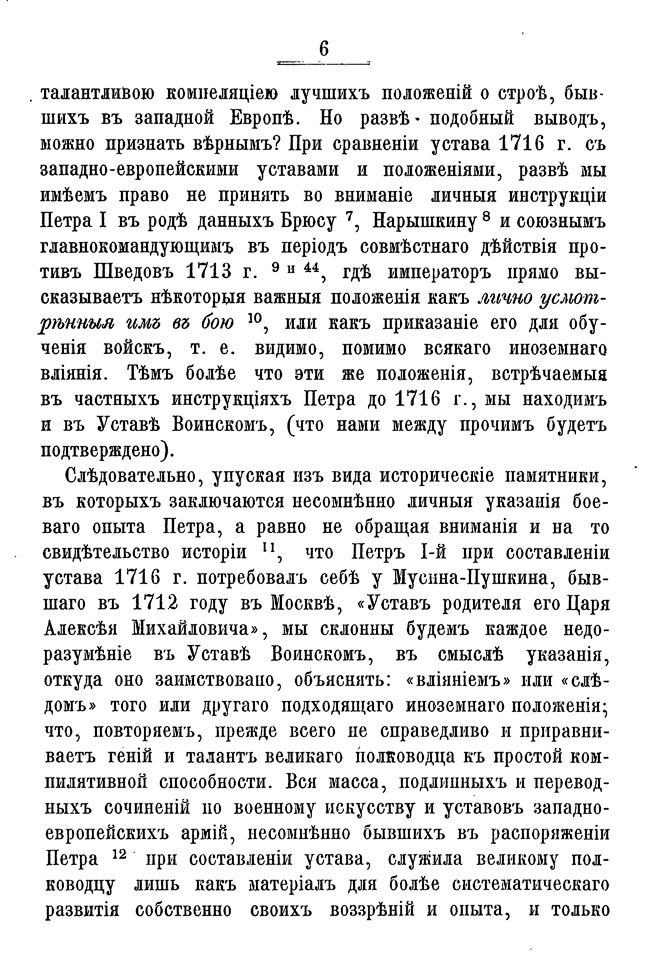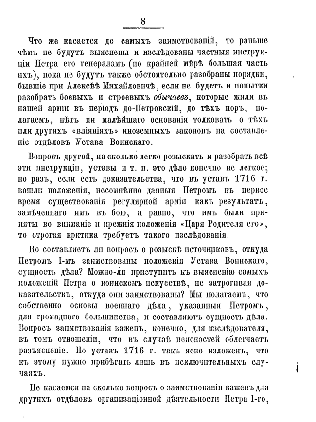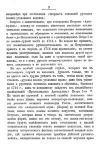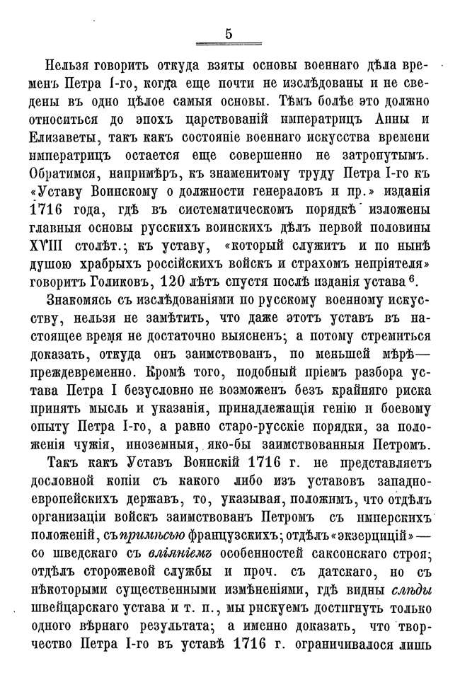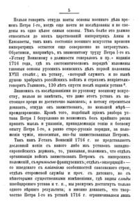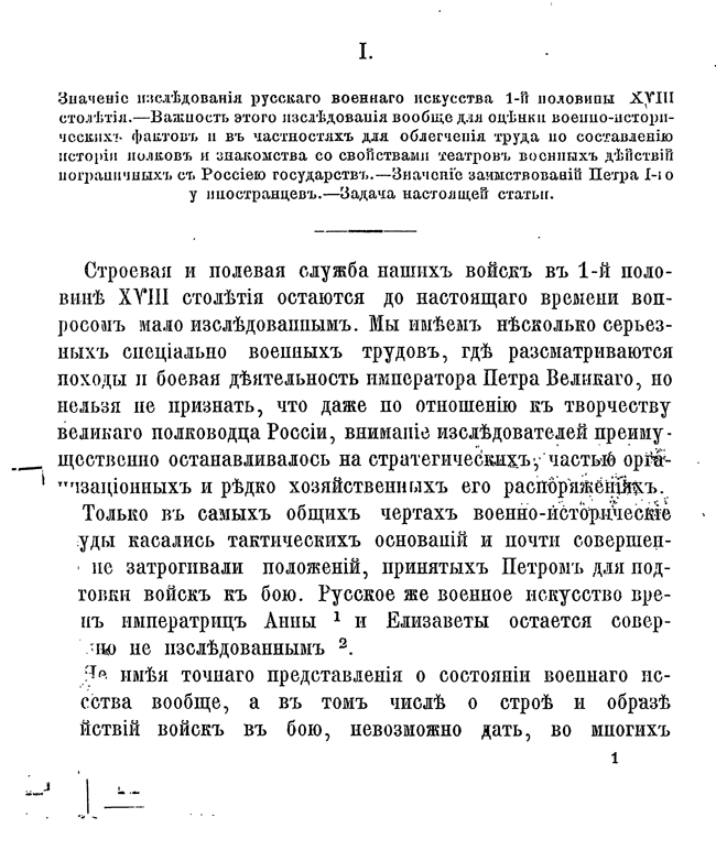 Масловский ищет корни военного искусства России XVIII века в первых воинских наставлениях и указах, чтобы с практической точки зрения объяснить качественное изменение тактики и стратегии армии. По его глубокому убеждению, только зная организационные и хозяйственные аспекты формирования войск, можно глубоко обсуждать действия полководца и оценивать его вклад в военное дело. В сборнике представлены основные указы, определяющие быт и деятельность армии от петровских распоряжений до времен Елизаветы. Петровский устав был сплавом разных европейских доктрин, выработанных в условиях многочисленных длительных войн, но он не стал непродуманной копией — царь отбирал лучшее на свой вкус и часто вносил исправления, основываясь на собственном боевом опыте. Неустанная работа над ошибками — одно из главных достоинств Петра Первого, поэтому Масловский счел необходимым включить в сборник ряд документов, не являвшихся напрямую распоряжением для всего войска, но, в виде рекомендации, способные объяснить развитие воинской мысли монарха.