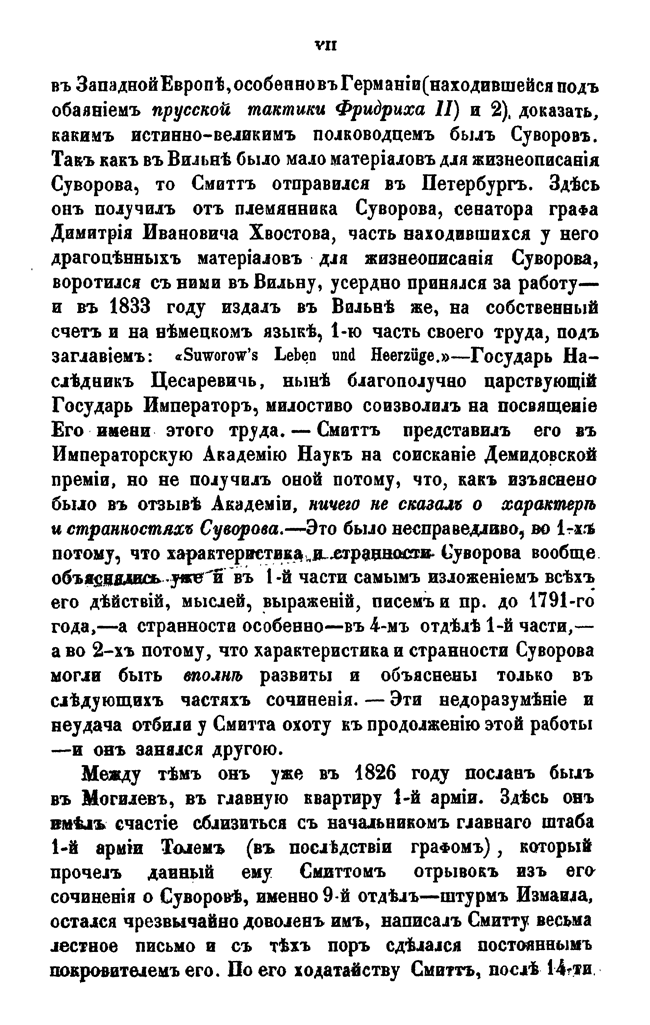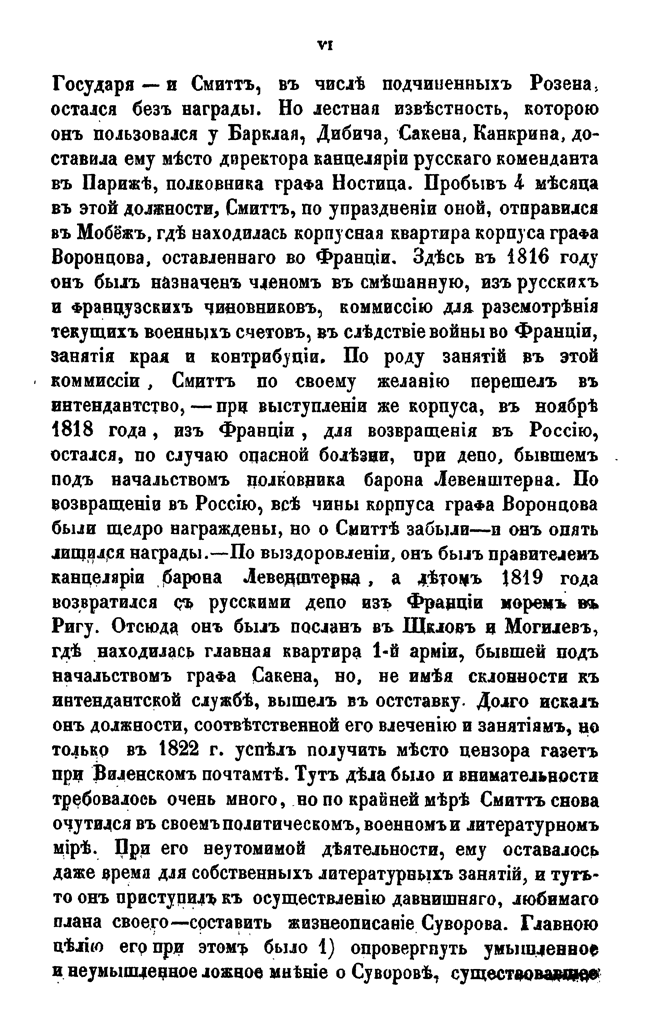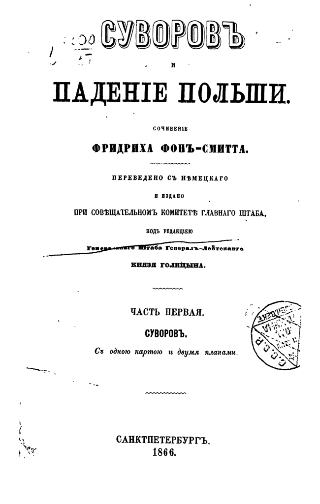 Эта книга долгое время считалась наиболее ценнной биографией великого русского полководца. Несмотря на название, основное внимание уделено имено жизни самого Суворова, Для себя Смитт выдвинул следующие цели: 1) изобразить правдиво падение Польской республики и, в тоже время, жизнь и подвиги Суворова 2) опровергнуть ложное мнение о Суворове, существовавшее в Западной Европе и, особенно, Германии 3) показать актами и документами истинное величие такого человека, как Суворов. Со всеми этими задачами автор вполне справился.