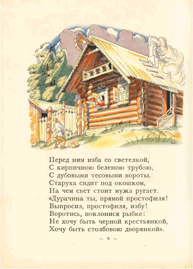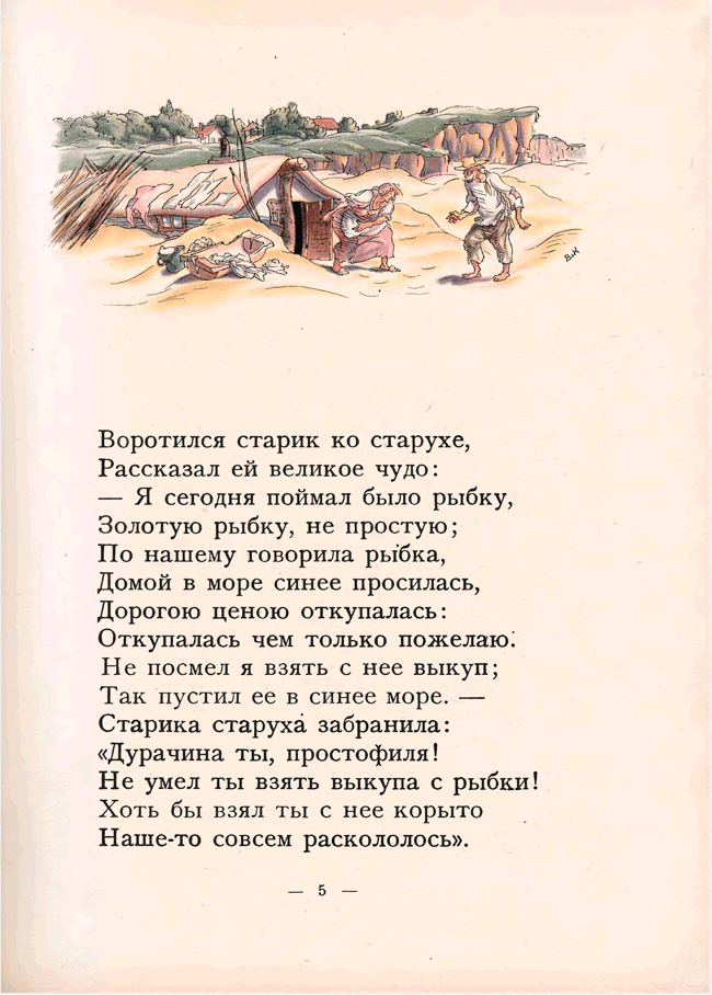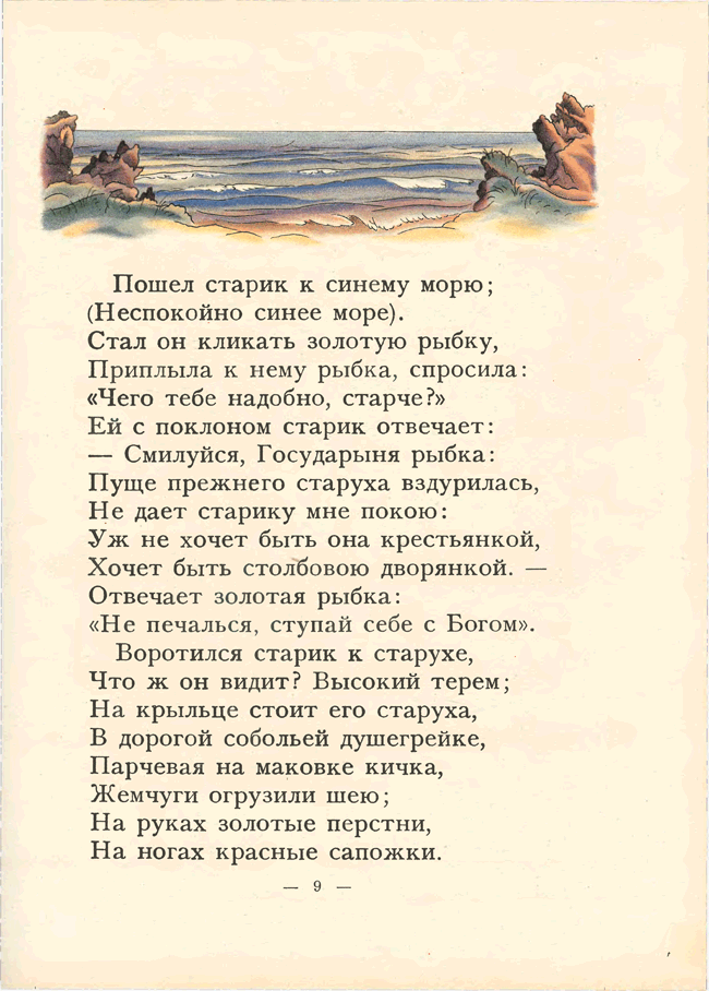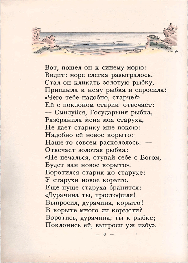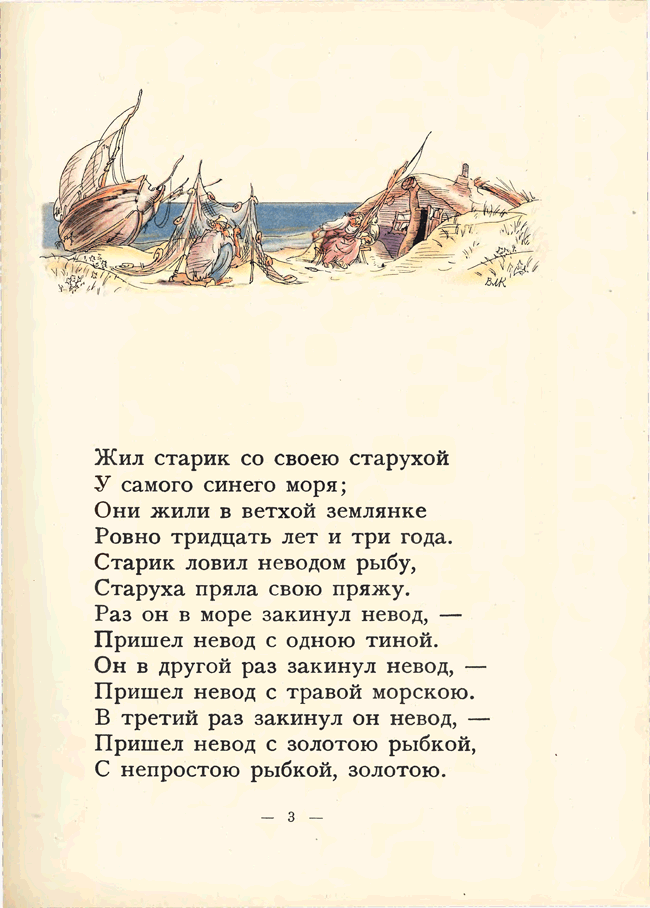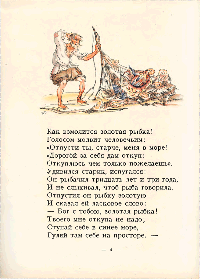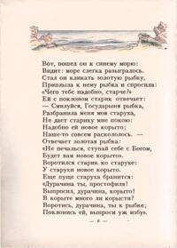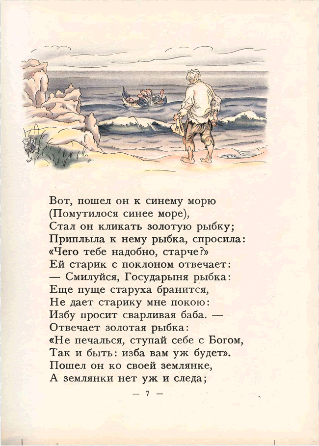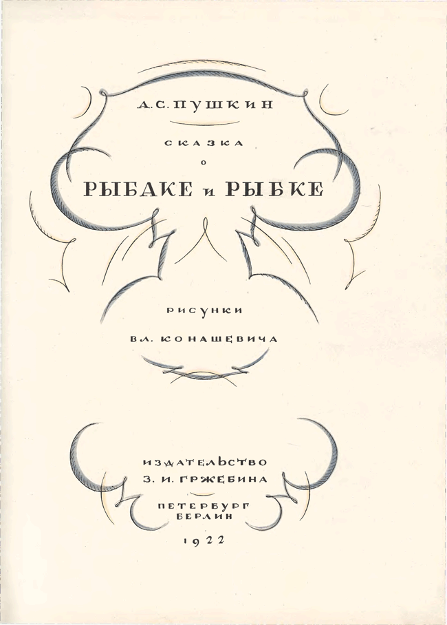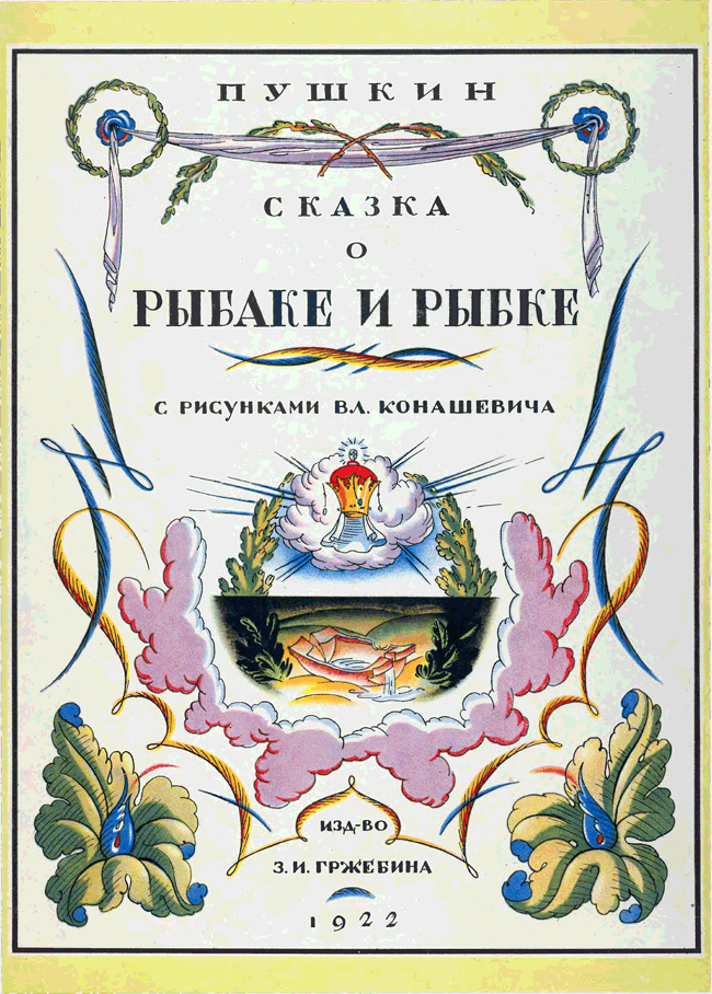«Сказка о рыбаке и рыбке» А. С. Пушкина иллюстрировалась многими художниками начиная с 1858 года. Но именно издание 1922 года с акварельными иллюстрациями В. М. Конашевича и послесловием известного пушкиниста Н. Лернера снискало известность. Изящный и легкий слог Пушкина требовал не менее изящных иллюстраций, и знаменитое издательство З. И. Гржебина не ошиблось, предложив эту работу Конашевичу. Это была первая работа художника с пушкинскими сказками. Цветная литография и акварель – любимые техники художника-иллюстратора. В 1929 году Конашевич создает иллюстрации к этой же сказке, но уже в другой технике – гравюре на дереве. Пушкиниана Конашевича – особый и узнаваемый мир.