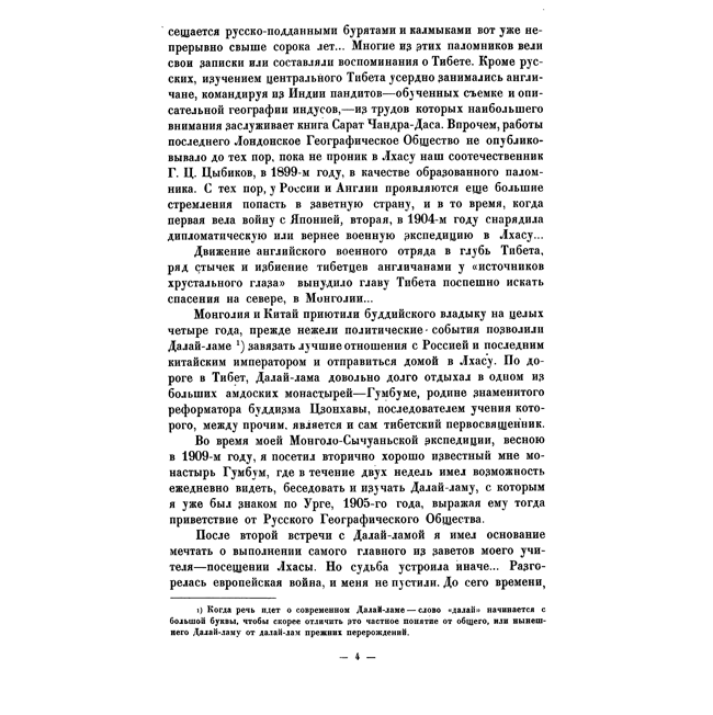 Выполняя главный завет своего учителя Н. М. Пржевальского, Козлов участвовал в экспедициях в Тибет, где в монастыре Гумбум имел возможность видеть, беседовать и изучать Далай-ламу. Книга включает в себя подробное описание встреч русского путешественника с Далай-ламой XIII в 1905 и 1909 гг. Автор также рассказывает о Тибете и его столице — Лхасе. Вместе с тем в этот труд вложена и основная мысль: «как установить сношения России с Тибетом?»