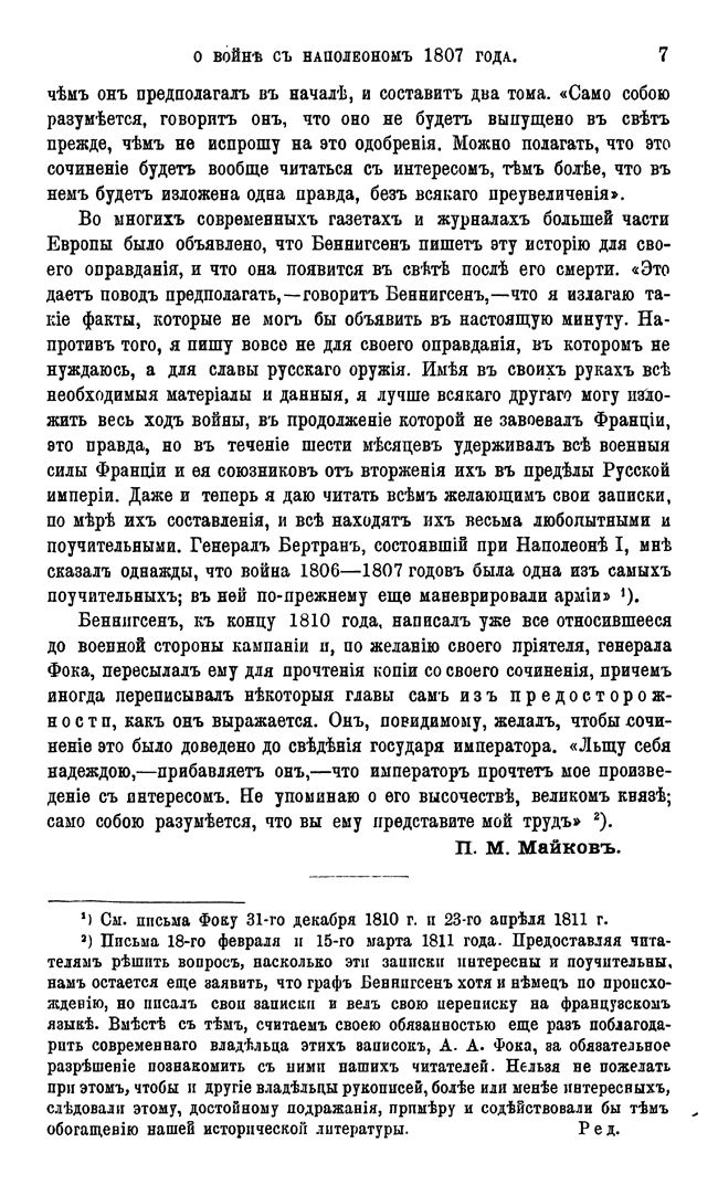 Майков подготовил к публикиции записки генерала Беннигсена, посвященные войне 1807 года. Неоднозначно воспринимаемая у нас фигура, получившая славу «закулисного интригана» в период Отечественной войны, в кампании