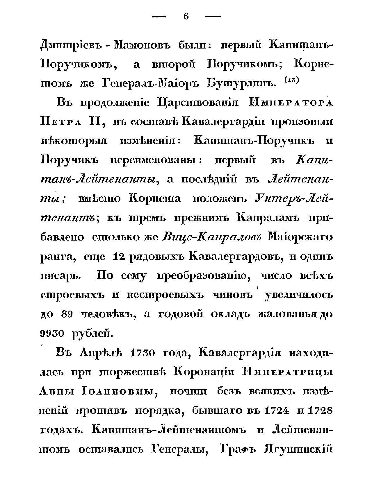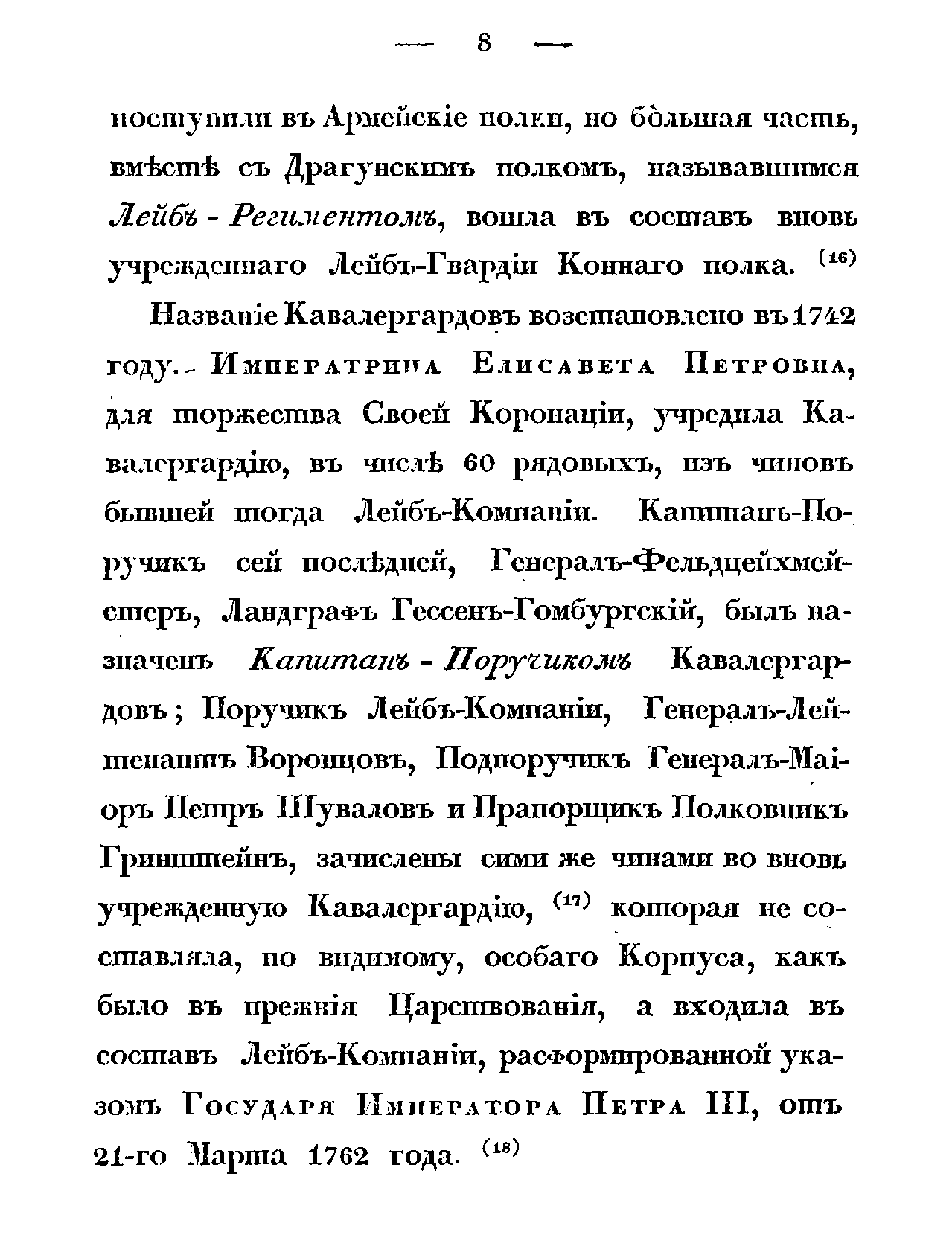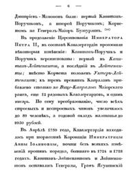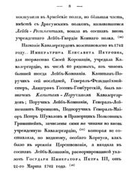 Документальное описание боевых действий полка и знаменательных исторических событий, связанных с ним, за период 1724 – 1832 годов. Приведены поименные списки командиров и офицеров полка, сравнительные таблицы штатного числа чинов и окладного жалования, описания униформы, вооружения и штандартов.