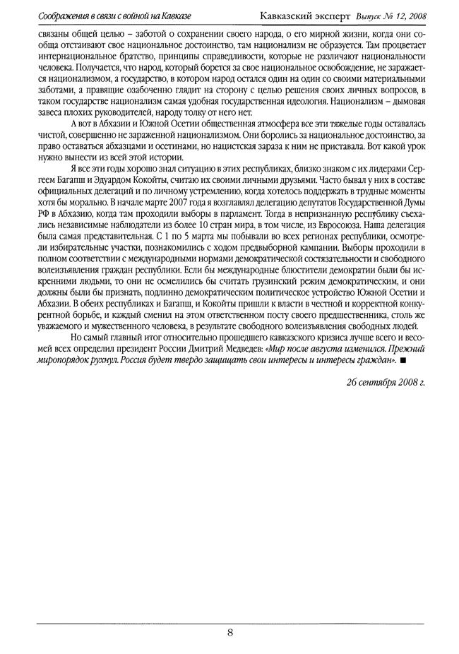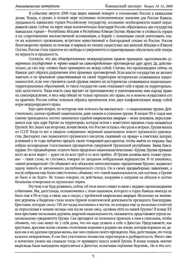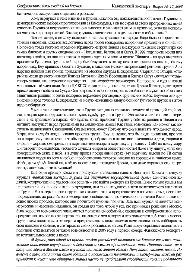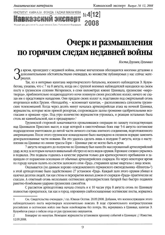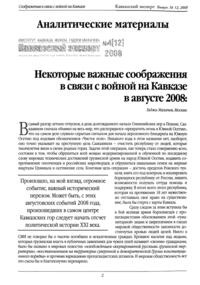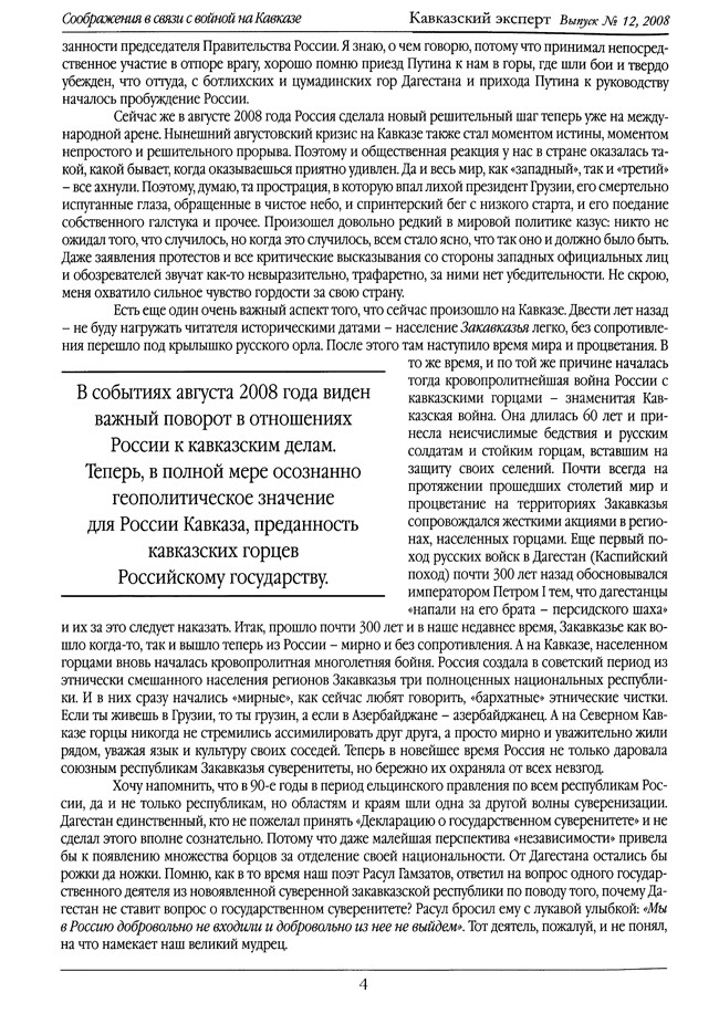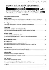 Четвертый выпуск журнала «Кавказский эксперт» содержит статьи, анализирующие события в Грузии в 2008 году. Тексты раздела «аналитические материалы» подготовлены экспертами Института Кавказа Фонда Гаджи Махачева и отражают их собственные взгляды и оценки. Хроника пятидневной войны в Грузии в 2008 году восстанавливает события 7-12 августа.