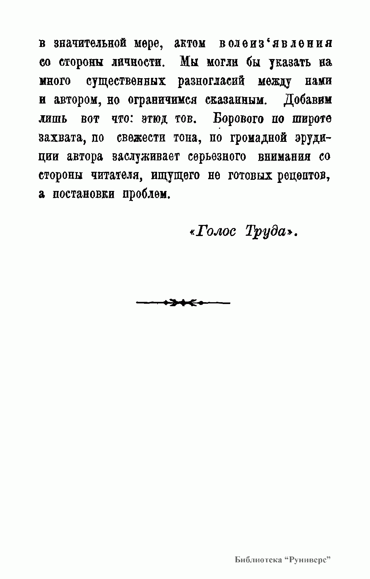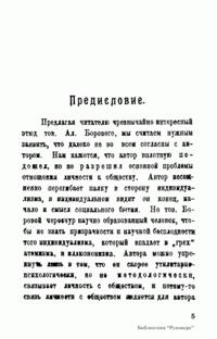 Из Предисловия издательства "Голос Труда": "Нам кажется, что автор вплотную подошел, но не разрешил основной проблемы отношения личности к обществу. Автор несомненно перегибает палку в сторону индивидуализма, в индивидуальном видит он конец, начало и смысл социального бытия... Но тов. Боровой чересчур научно образованный человек, чтобы не знать призрачности и научной бесплодности того индивидуализма, который впадает в „грех" атомизма, и иллюзионизма".