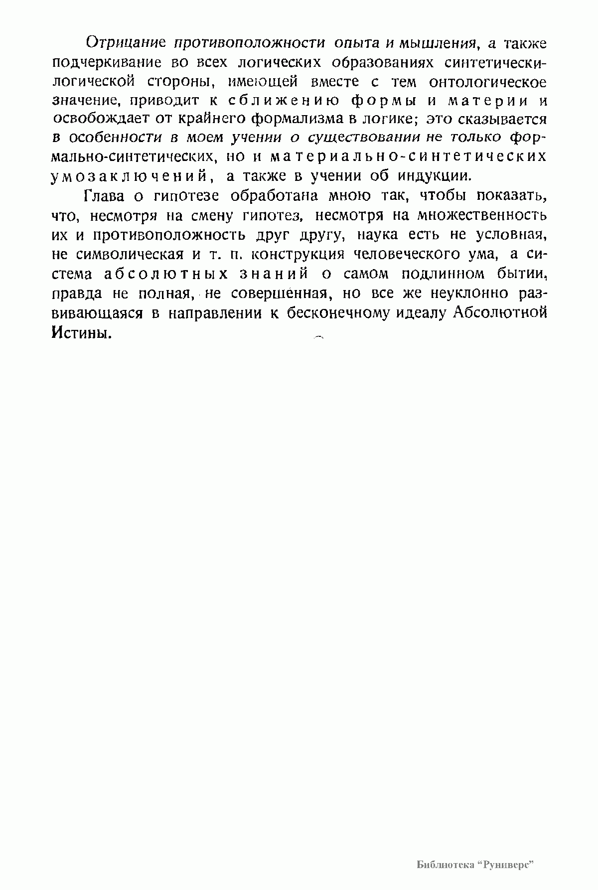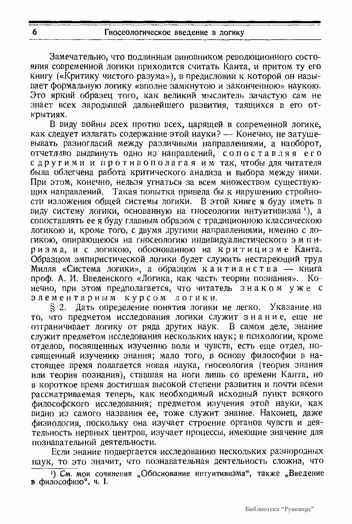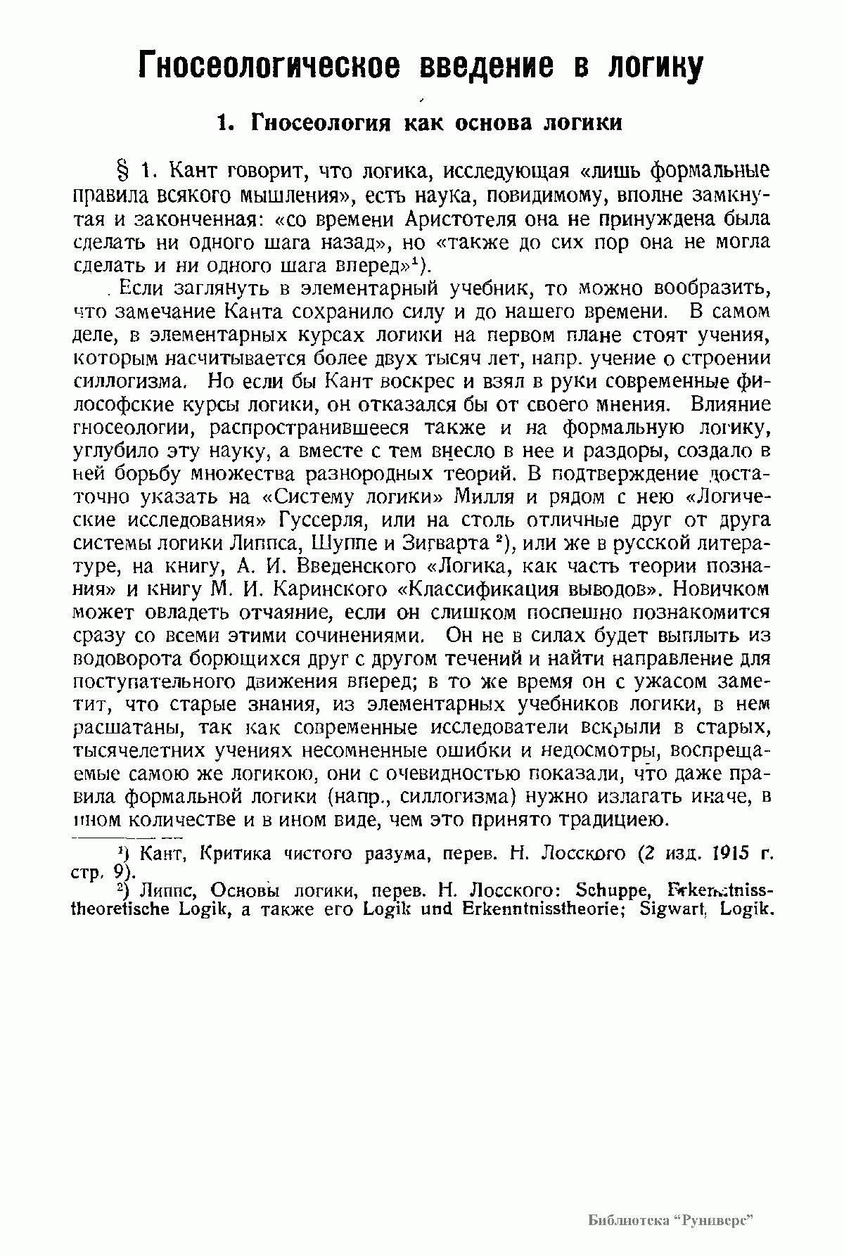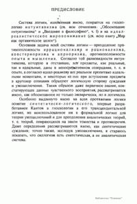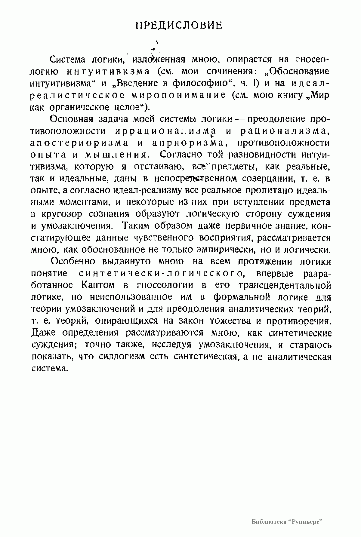 «Логика»: в 2-х книгах. Часть 1. «Суждение. Понятие». Часть 2. «Доказательство. Умозаключение», Петроград, 1922; 2-е изд. (исправленное и дополненное) — Берлин, 1923. Система логики, изложенная мною, опирается на гносеологию интуитивизма (см. мои сочинения: "Обоснование интуитивизма" и "Введение в философию", ч. I) и на идеал-реалистическое миропонимание (см. мою книгу "Мир как органическое целое"). "Основная задача моей системы логики — преодоление противоположности иррационализма и рационализма, апостериоризма и априоризма, противоположности опыта и мышления. Согласно той разновидности интуитивизма, которую я отстаиваю, все предметы, как реальные, так и идеальные, даны в непосредственном созерцании, т. е. в опыте, а согласно идеал-реализму все реальное пропитано идеальными моментами, и некоторые из них при вступлении предмета в кругозор сознания образуют логическую сторону суждения и умозаключения. Таким образом даже первичное знание, констатирующее данные чувственного восприятия, рассматривается мною, как обоснованное не только эмпирически, но и логически".