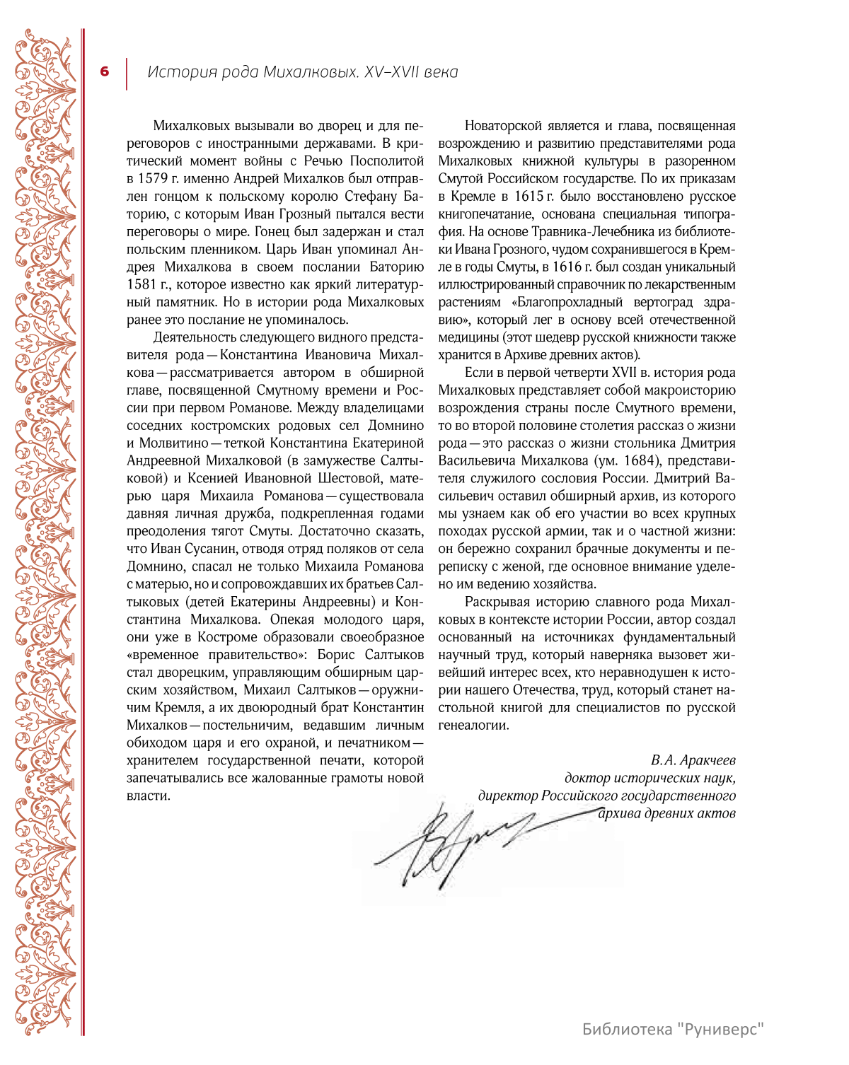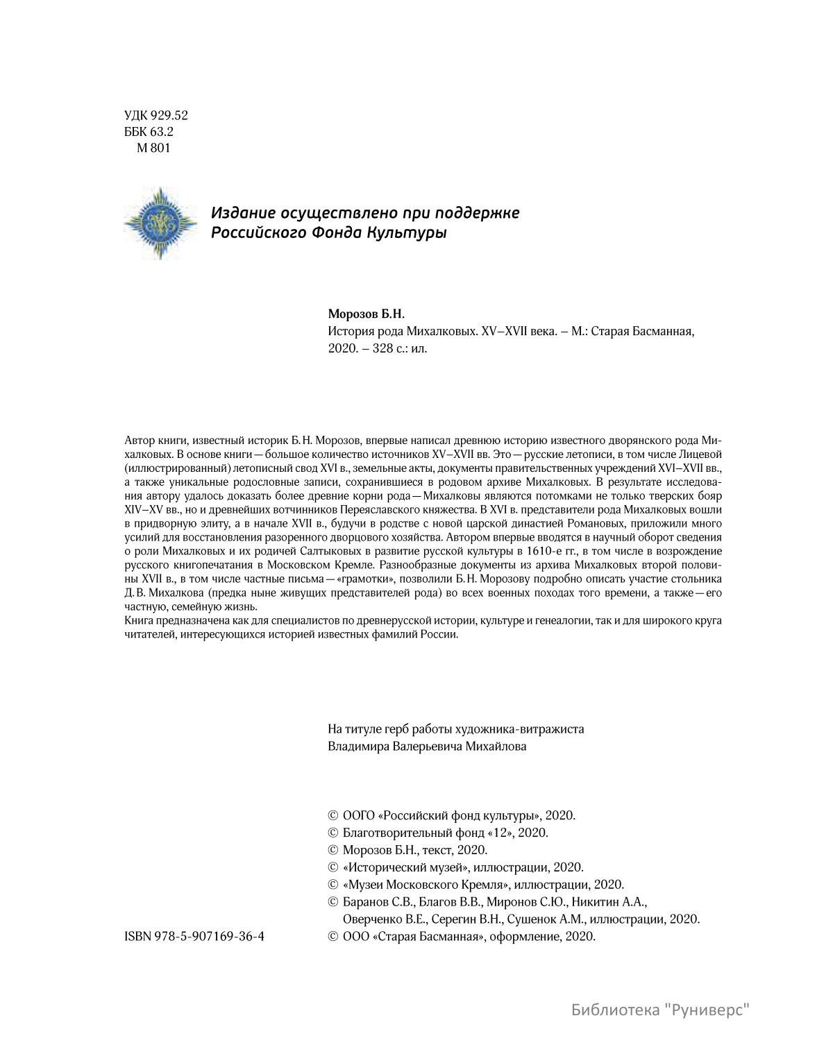 В результате исследова-ния автору удалось доказать более древние корни рода — Михалковы являются потомками не только тверских бояр XIV–XV вв., но и древнейших вотчинников Переяславского княжества. В XVI в. представители рода Михалковых вошли в придворную элиту, a в начале XVII в., будучи в родстве с новой царской династией Романовых, приложили много усилий для восстановления разоренного дворцового хозяйства. Автором впервые вводятся в научный оборот сведения о роли Михалковых и их родичей Салтыковых в развитие русской культуры в 1610-е гг., в том числе в возрождение русского книгопечатания в Московском Кремле. Разнообразные документы из архива Михалковых второй полови-ны XVII в., в том числе частные письма — «грамотки», позволили Б. Н. Морозову подробно описать участие стольника Д. В. Михалкова (предка ныне живущих представителей рода) во всех военных походах того времени, а также — его частную, семейную жизнь.<br>