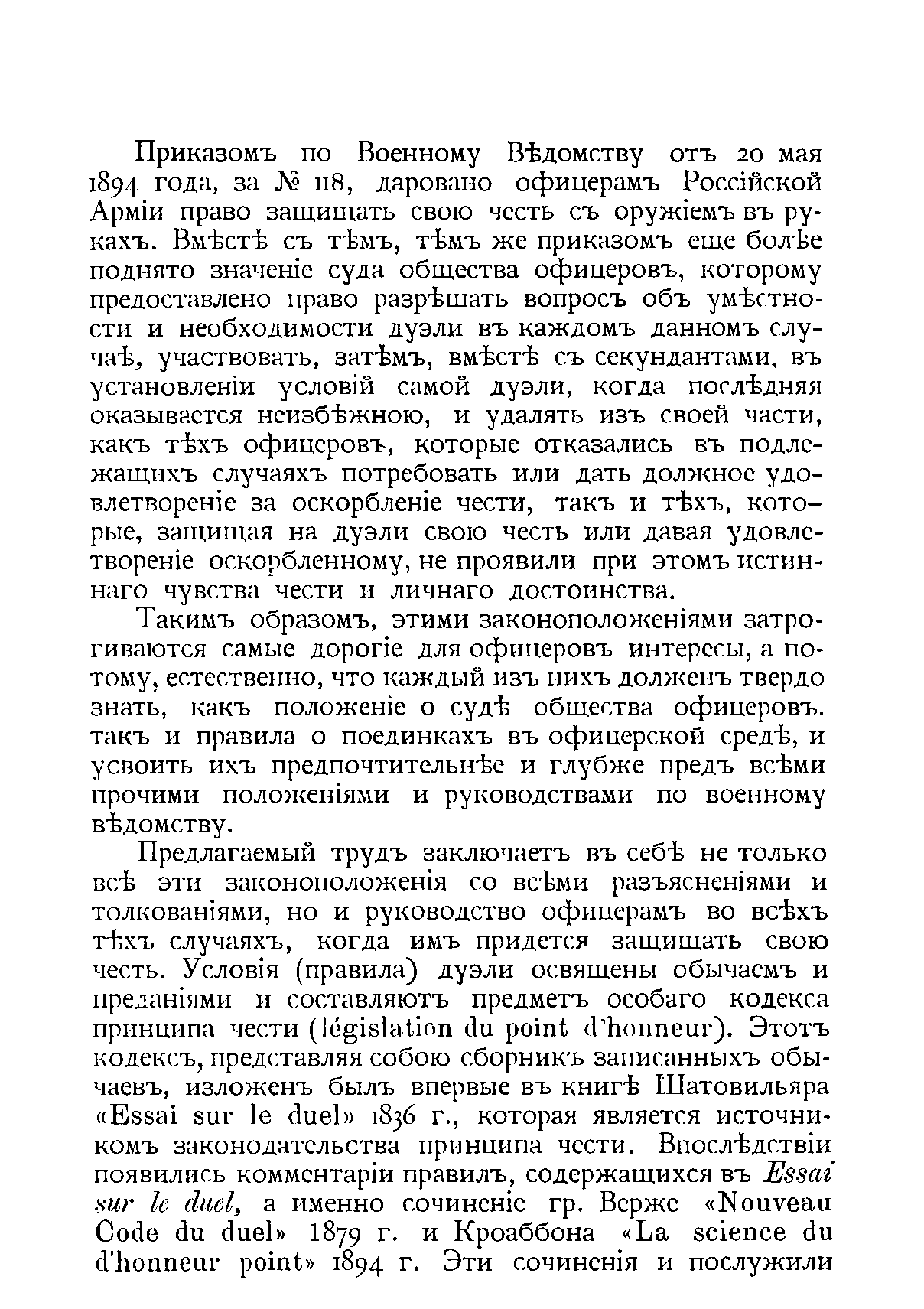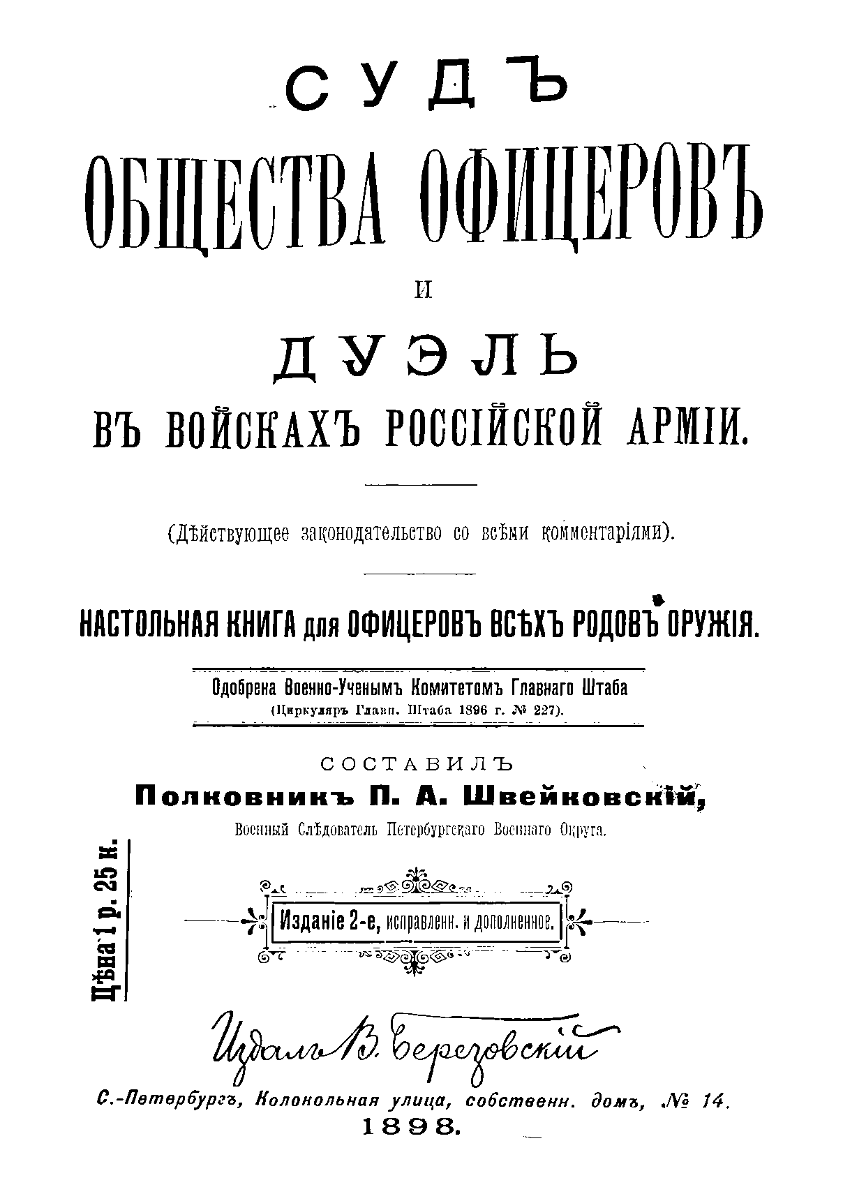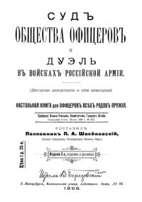 Монография военного следователя Петербургского военного округа полковника П. А. Швейковского посвящена детальному исследованию дуэльного кодекса и правилам дуэли, разрешенной в Российской императорской армии приказом по Военному ведомству от 18 мая 1894 г. Вместе с тем, автор обращает особое внимание в своей работе на усиление роли судов офицерской чести или судов общества офицеров в войсковых частях для урегулирования взаимоотношений в офицерской среде. Предлагаемый на суд заинтересованного читателя труд Швейковского снабжен многочисленными законодательными актами и подзаконными установлениями, позволяющими детально разобраться в дуэльном законодательстве Российской империи.
