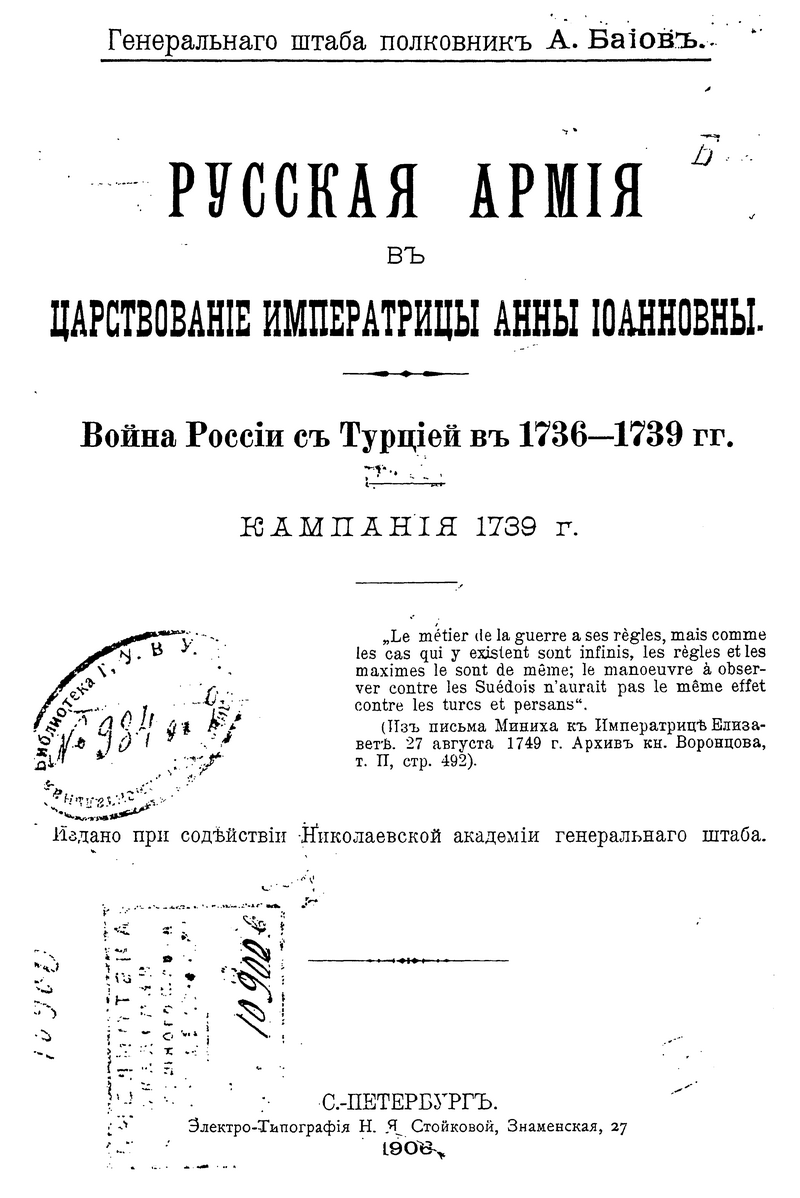 Масштабный военно-исторический труд видного военного историка и теоретика генерала А.К. Байова посвящено как политической истории, так и истории вооруженных сил России в «немецкое» десятилетие правления Анны Ивановны, является итогом его многолетних исследований. Автор в предисловии к данной книге справедливо замечает, что долгие годы тема русско-турецкой войны 1736-1739 гг. признавалась «малопоучительной». Тем выгоднее отличается представленный на рассмотрение в Академию Генерального штаба труд Байова, получивший законное признание и отмеченный большой премией Академии имени Леера. Труд основан на богатейшей документальной базе российских архивов, детально описывает деятельность русских войск в данной войне, вплоть до отдельных частей и соединений. Фундаментальный труд А.К. Байова до сих пор не утратил своей научной актуальности и значимости.