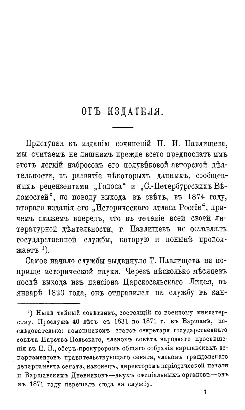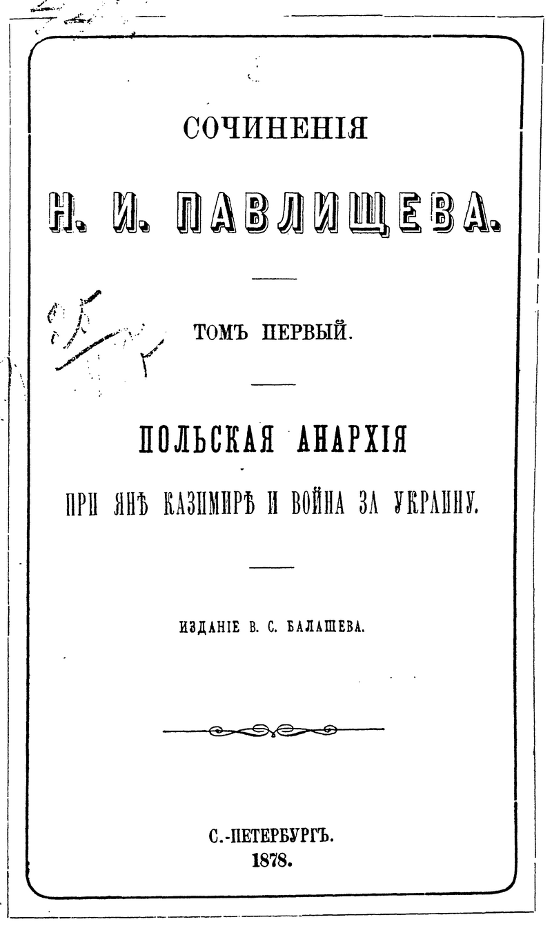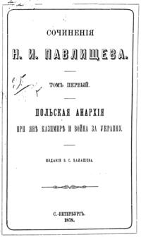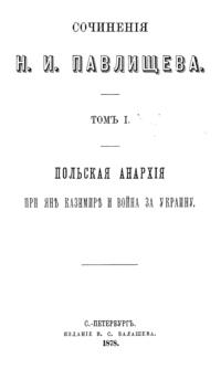 Последние годы жизни Н.И. Павлищев занимался изданием своих трудов, в числе которых обширная монография по истории Польши второй половины XVI – XVII вв. «Польская анархия при Яне Казимире и война за Украину», составившая т. 1–3 его сочинений. В рецензиях того времени отмечалось основательное знание источников и исторических трудов («Вестник Европы», 1879, кн.6). Ян Казимир, второй сын Сигизмунда III, вступил на престол в 1648 году после брата своего Владислава IV. Он унаследовал войну с казаками за Украину, вспыхнувшую в год смерти Владислава, когда Богдан Хмельницкий, разбив и полонив двух польских гетманов, явился победителем под стенами Львова в Червонной Руси. Эта война, заполняющая всё двадцатилетнее царствование Яна Казимира, длилась ещё 31 год после него и кончилась при Августе II карловицким миром (1699), по которому турки возвратили Польше Каменец с Подолией и частью Украины. Она основательно расшатала здание Речи Посполитой. Автор предпосылает царствованию Яна Казимира «Пролог» (т. 1), посвященный происхождению войны за Украину, а в «Эпилоге» излагает её окончание, что и разделяет монографию на три части. Остается только 72 года до первого раздела. В этом отношении автор считает свою работу введением в эпоху разделов, которую в его время осветили в своих монографиях историки С.М. Соловьёв и Н. Ив. Костомаров.