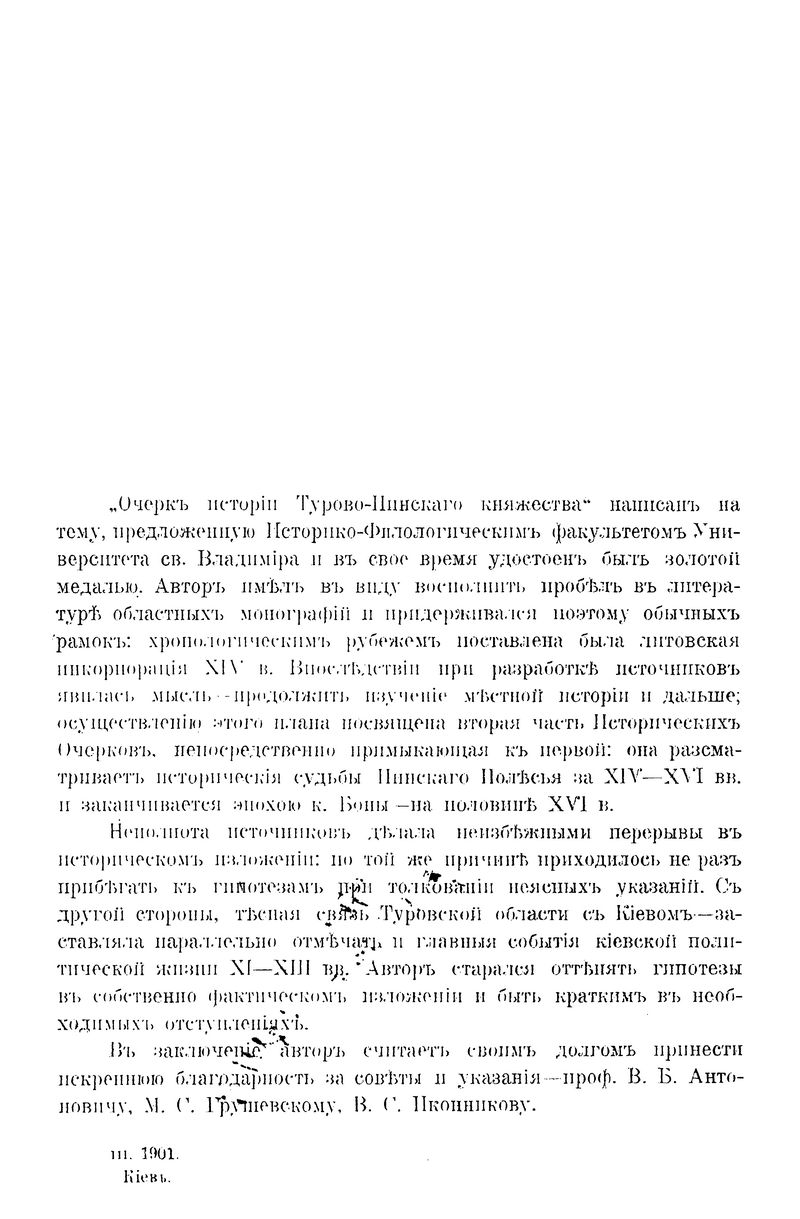 На историко-филологическом факультете Киевского университета св. Владимира в конце XIX в. велась серьёзная научная работа по изучению истории Древней Руси. Результатом этой работы явилась серия областных монографий. В эту серию входит и предлагаемое исследование Александра Грушевского. Его первая часть знакомит с историей Турово-Пинского княжества XI – XIII, находившегося в бассейне реки Припять.