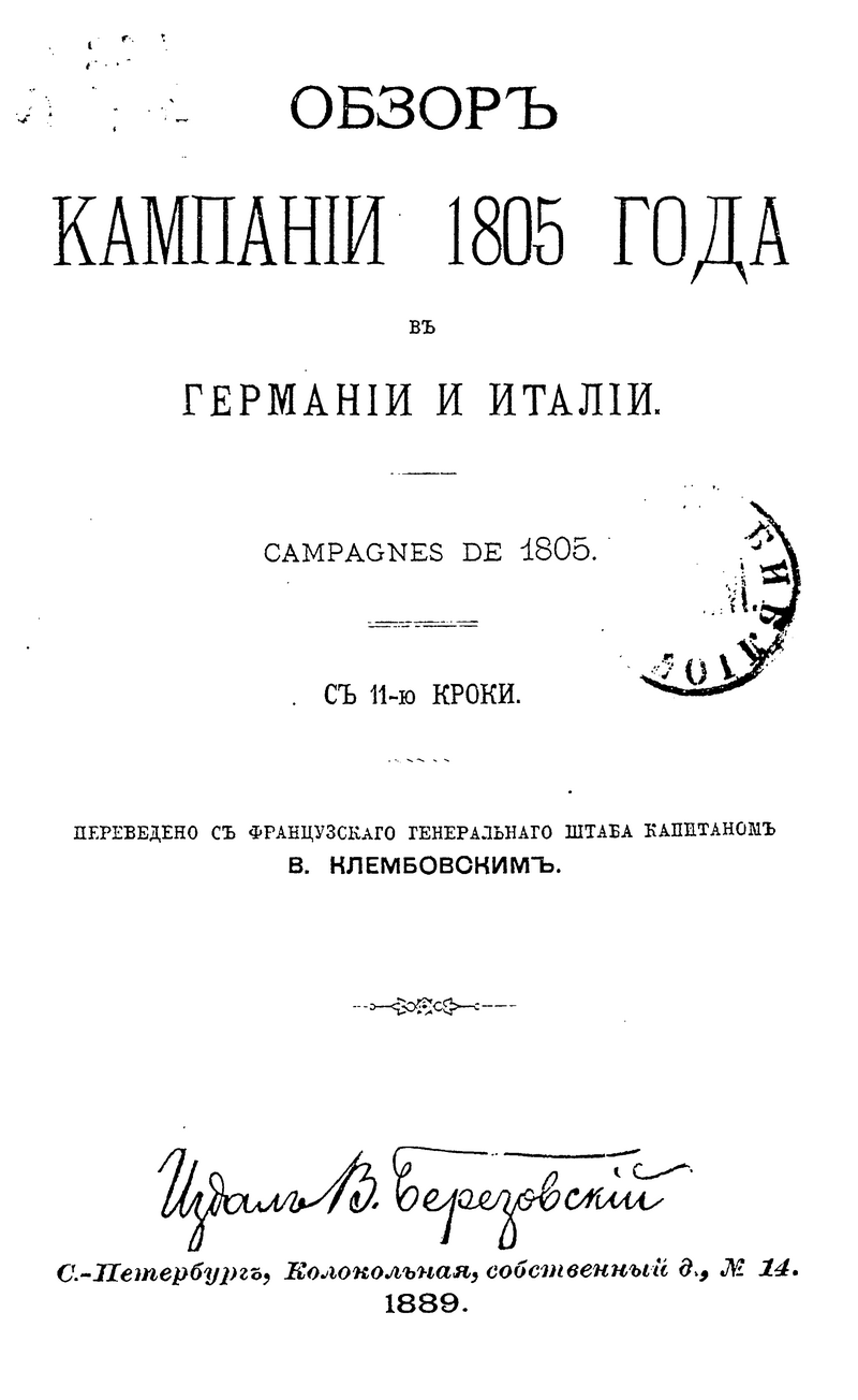 Оно было подготовлено к изданию и переведено В.Н. Клембовским, выпускником академии Генерального штаба, в дальнейшем известным военным деятелем, занимавшим должность командующего Северным фронтом накануне военного переворота генерала Л.Г. Корнилова в августе 1917 г. Через год он был принят на службу в Красную Армию, некоторое время являлся председателем военно-исторической комиссии по изучению опыта мировой войны, а в 1920 г. — членом Особого совещания при главкоме Вооруженных сил Республики. Данная книга в популярной форме довольно подробно описывает классическую кампанию 1805 г. в Европе, акцентируя внимание, главным образом на особенностях полководческого гения Наполеона.
