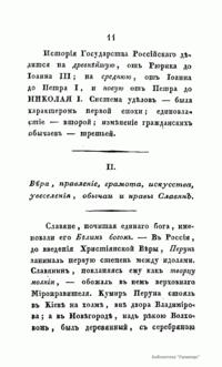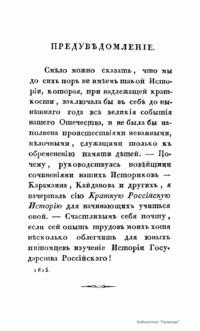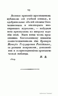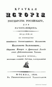 Данное учебное пособие, подготовленное магистром, а затем адъюнкт-профессором Московского университета Иларионом Васильевичем Васильевым, преподававшим русское законоведение. Оно представляет собой краткую аннотированную хронологию российской истории по правлениям князей и монархов, распределенную на три части: от Рюрика до Ивана III (862–1462), от Ивана III до Петра Великого (1462–1689) и от царствования Петра Великого до начала правления Николая I (1689–1830). Формально автор опирается на исследования М.Н. Карамзина, однако его взгляды ярко отражают консервативно- охранительную концепцию, доминирующую в системе образования России после 1825 г. Его перу также принадлежат такие труды как "Новейшее руководство к познанию российских законов" (Москва, 1826); "Фемида, или Начертание преимуществ прав, и обязанностей женского пола в России"(Москва, 1827); "Историческое обозрение актов и судебных бумаг в России" (в "Трудах Общества Истории и древностей российских", ч. V, Москва, 1830).