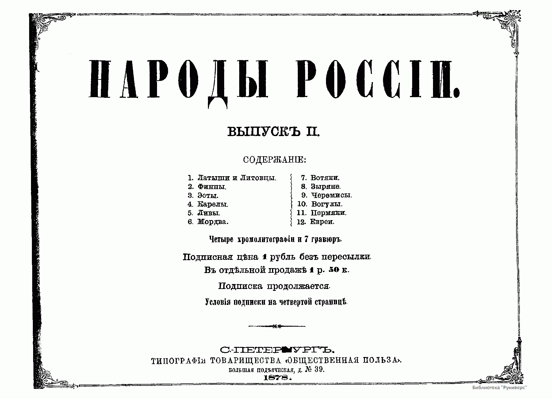 Масштабное научно-популярное исследование «Народы России», подготовленное известными российскими этнографами в период либеральных реформ Александра II, в эти годы пользовалось значительным читательским интересом. Это хорошо иллюстрированное обзорное издание, охватывающее необъятные географические и этнокультурные пространства, быт и нравы ногочисленных народов и народностей (выделено 45 основных народностей и народов), проживавших в Российской империи, и поныне представляется весьма познавательной книгой, далеко не потерявшей своей научно-практической значимости.