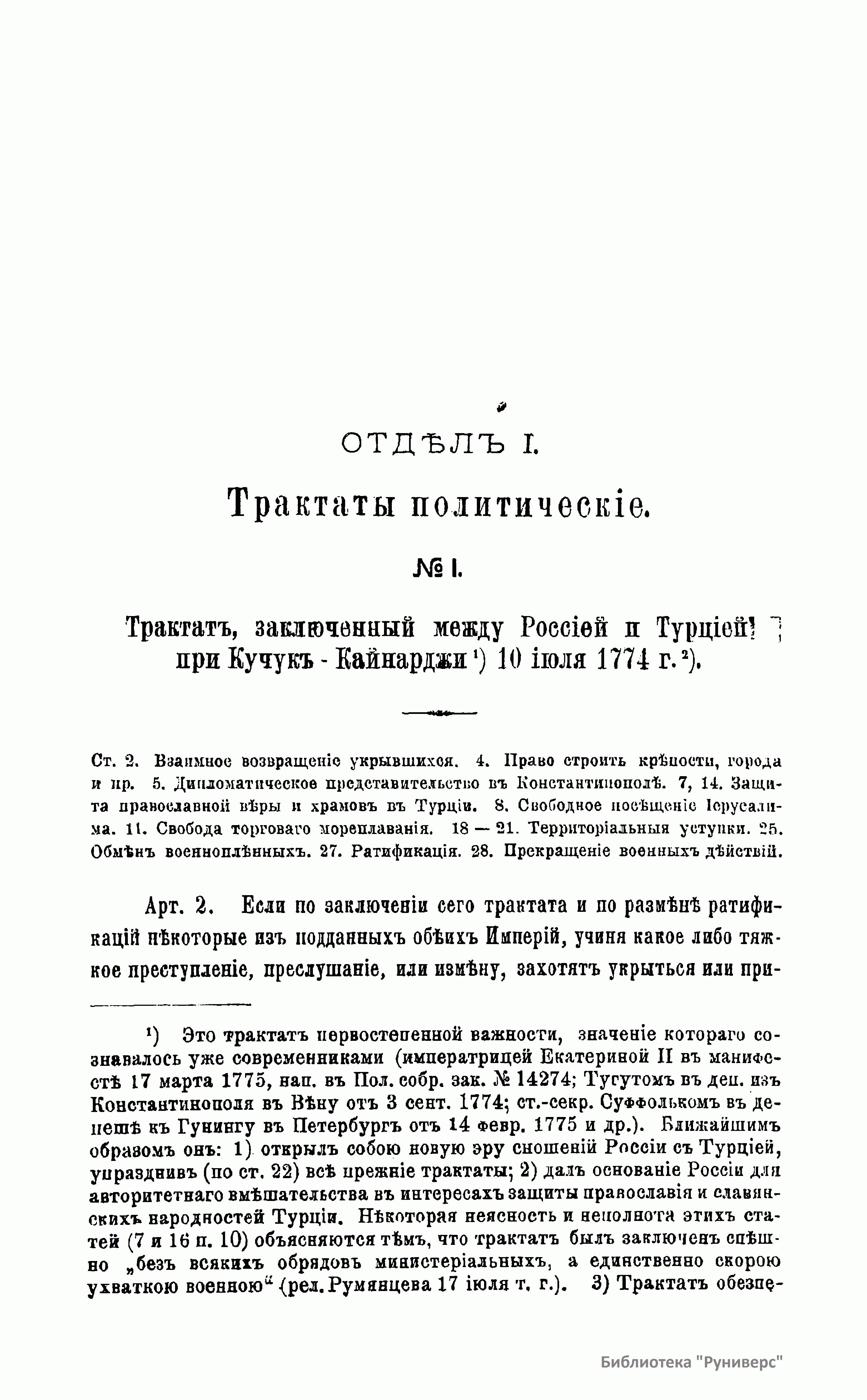 В данном сборнике документов выделено семь отделов. К важнейшим отнесены политические трактаты (всего три обширных документа – Кучук-Кайнарджийский мир 1774 г., Парижский трактат 1856 г. и Берлинский трактат 1878 г.). Второй отдел включает торговые договоры и соглашения России с зарубежными государствами в период с 1782 по 1904 гг. В третий отдел включена Бернская железнодорожная конвенция 1890 г. и дополнительная декларация 1893 г. В четвертом отделе помещены консульские конвенции с Францией, Германией, Италией и Нидерландами, заключенные Россией с 1874 по 1883 гг. Пятый отдел включает конвенции о наследственных правах с Францией, Германией, Италией и Испанией. Самый значительный по объему отдел посвящен соглашениям по судебным и административным вопросам, включающий двадцать пять разного рода конвенций. Наконец, седьмой отдел включает конвенции и декларации, подписанные в Гааге в 1899 г., посвященные правилам и обычаям в ходе военных действий. В качестве дополнения в сборник включены мирный договор с Японией 1905 г., торговая конвенция с Францией 1905 г. и договор о торговле и мореплавании с Болгарией 1905 г.