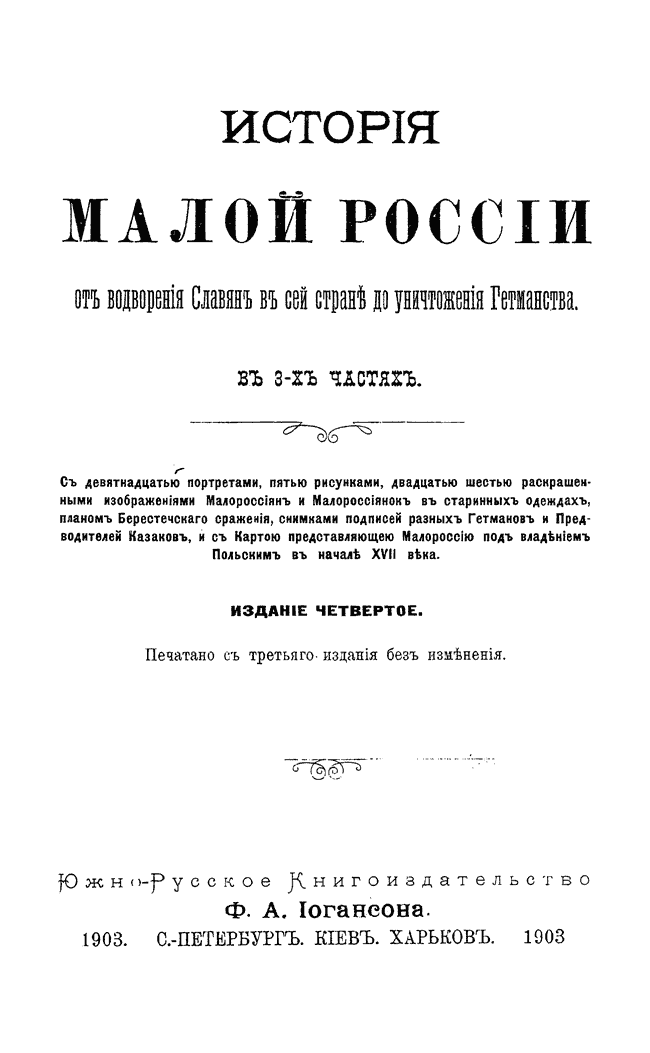 Первоначальный труд, посвященный в основном древней истории, был во втором издании 1830 г. дополнен описанием событий от времени присоединения Малороссии к России до упразднения Гетманства.