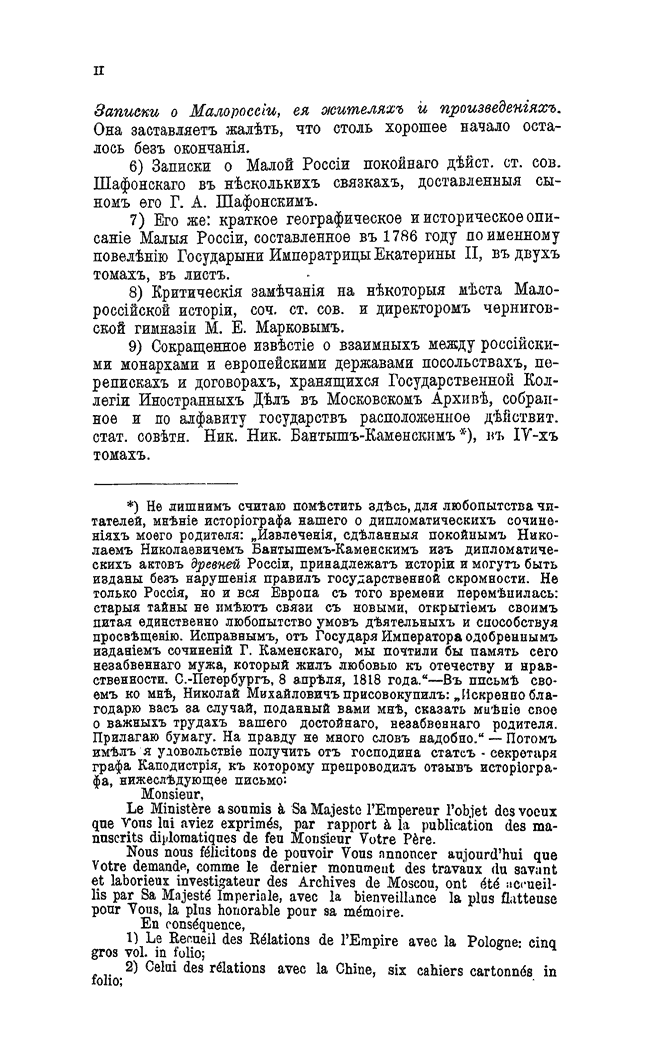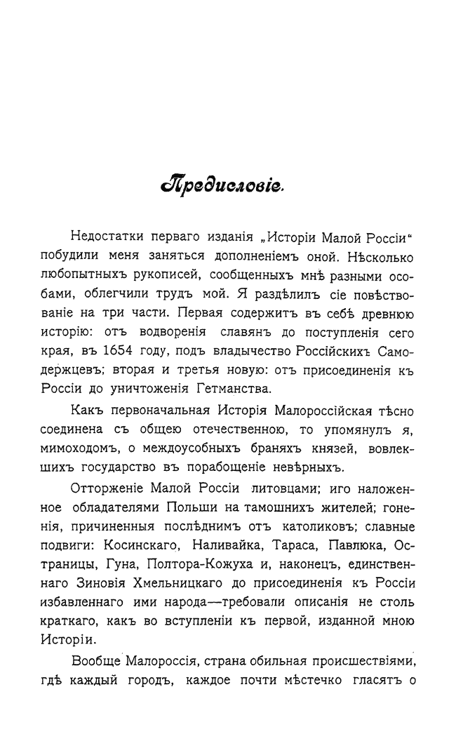 В авторском предисловии Д.Н. Бантыш-Каменский пишет: «Малороссия доселе не имела подробного дееписания на отечественном языке. Повествования иностранцев любопытные, но иногда пристрастные, оставались без всяких исследований. <…> Малороссия, страна обильная происшествиями где каждый город, каждое почти местечко гласят о славе ее обитателей; где искони процветало благочестие; в недрах коей покоится прах первого Законодателя нашего и нескольких мудрых Государей: страна, верная Богу — в оковах, Царям — во время вторжения неприятелей; украсившая век ПЕТРА и ЕКАТЕРИНЫ многими достойными сынами; доселе гордящаяся отраслями их — заслуживала подробного дееписания».