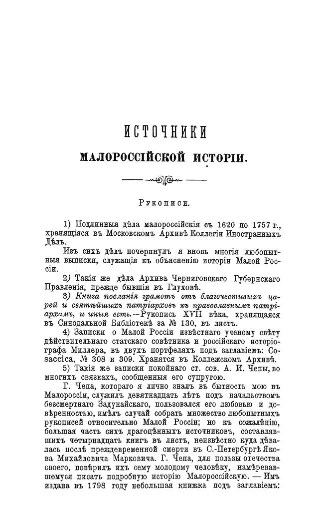 Первая систематическая история Малороссии, впервые изданная в 1822 году. Написана автором в период работы правителем канцелярии военного губернатора Малороссии князя Н. Г. Репнина, по его поручению.