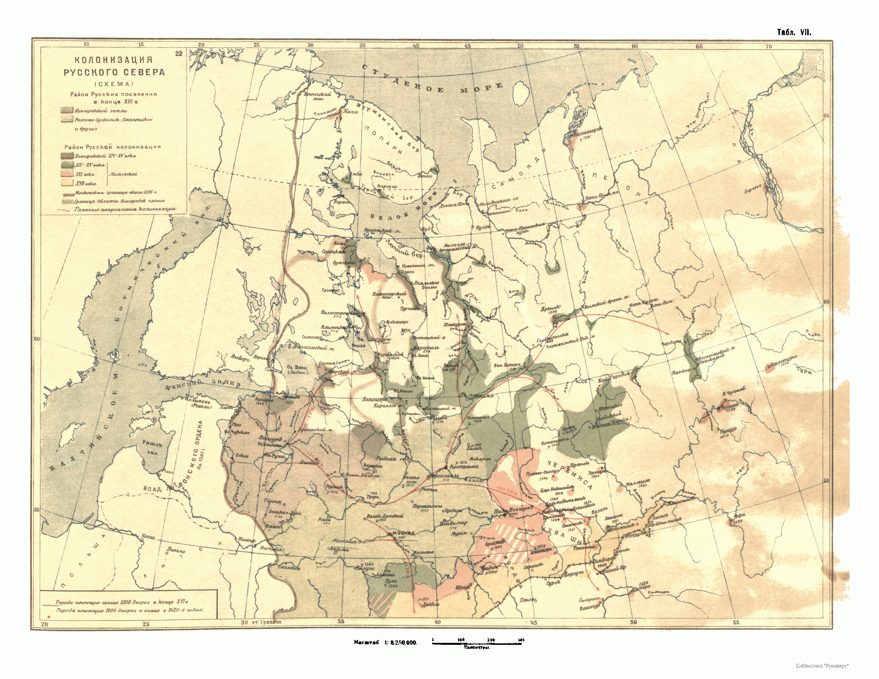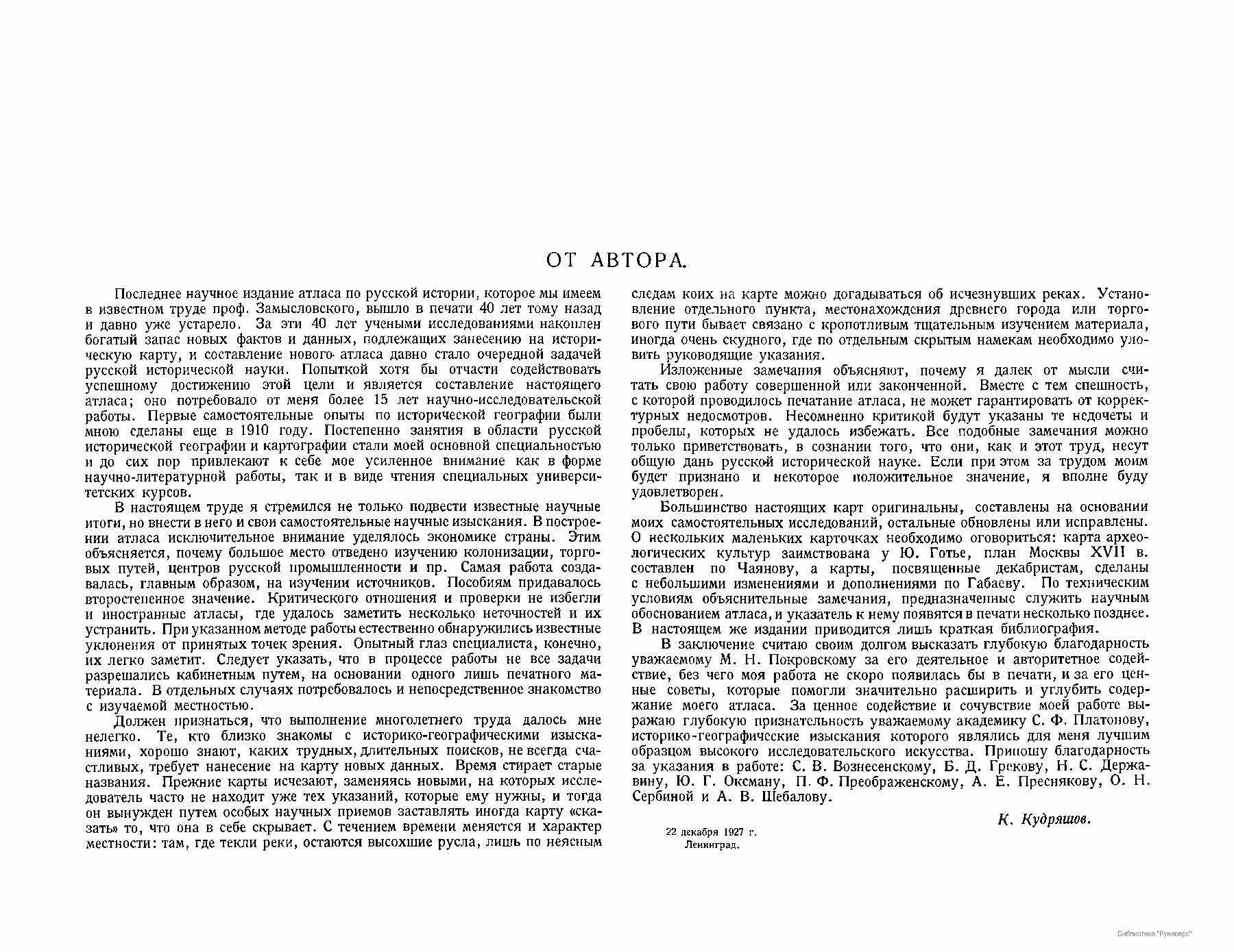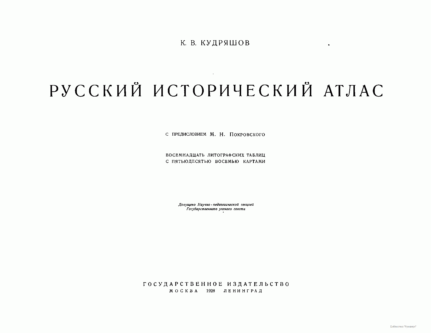Русский исторический атлас. Автор – Кудряшов Константин Васильевич, доктор исторических наук (1885–1962). Москва–Ленинград. 1928. В данном атласе, состоящем из 58 карт, автор обобщил свои работы по исторической географии за 15 лет. В построении данного атласа основное внимание автора было уделено экономической истории. Источниковедческий раздел, предшествующий графике, на котором базируется данный труд, достаточно обширен. При выходе в свет атлас получил первую премию от Экспертной комиссии Цекубу и ЦБ СНР.