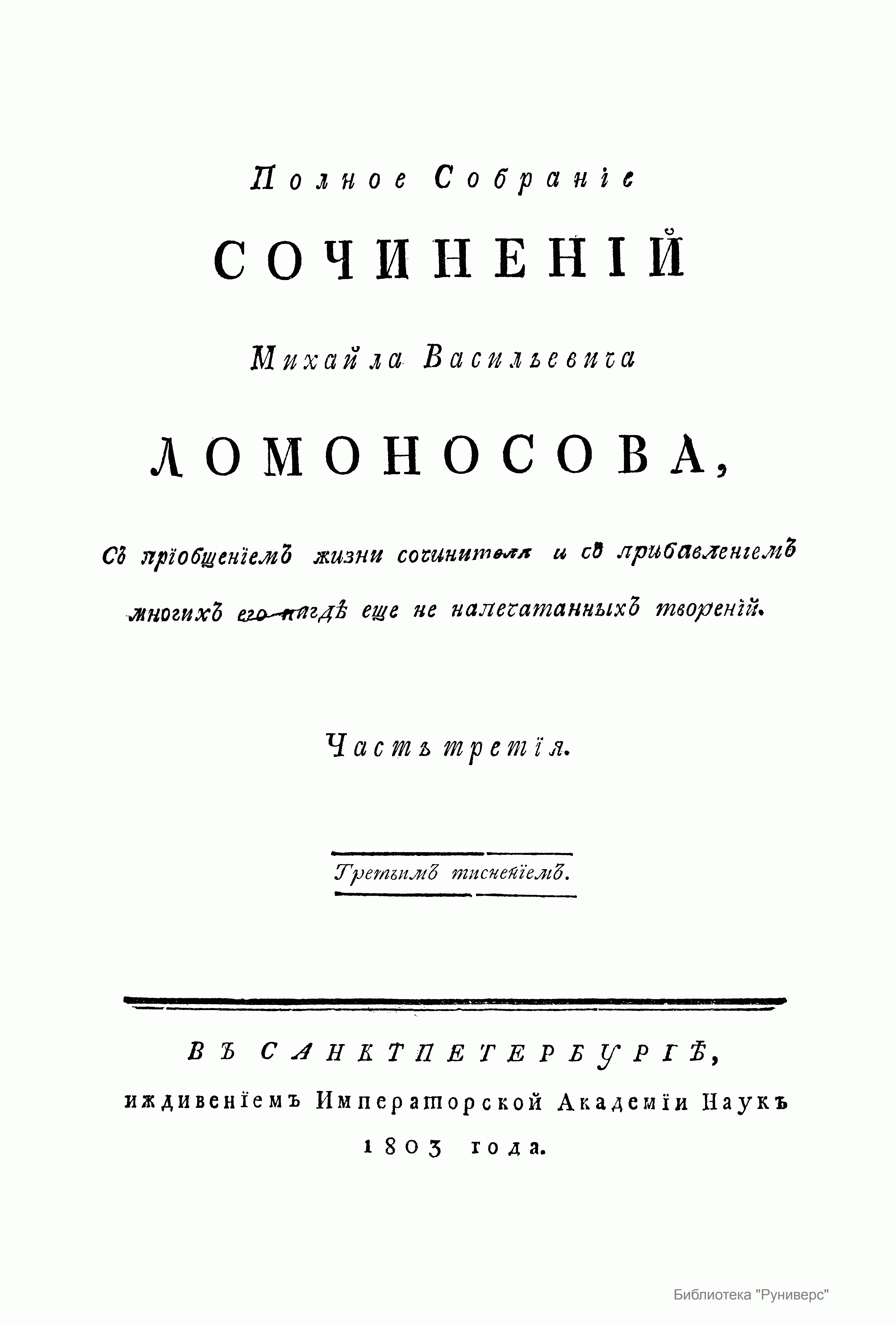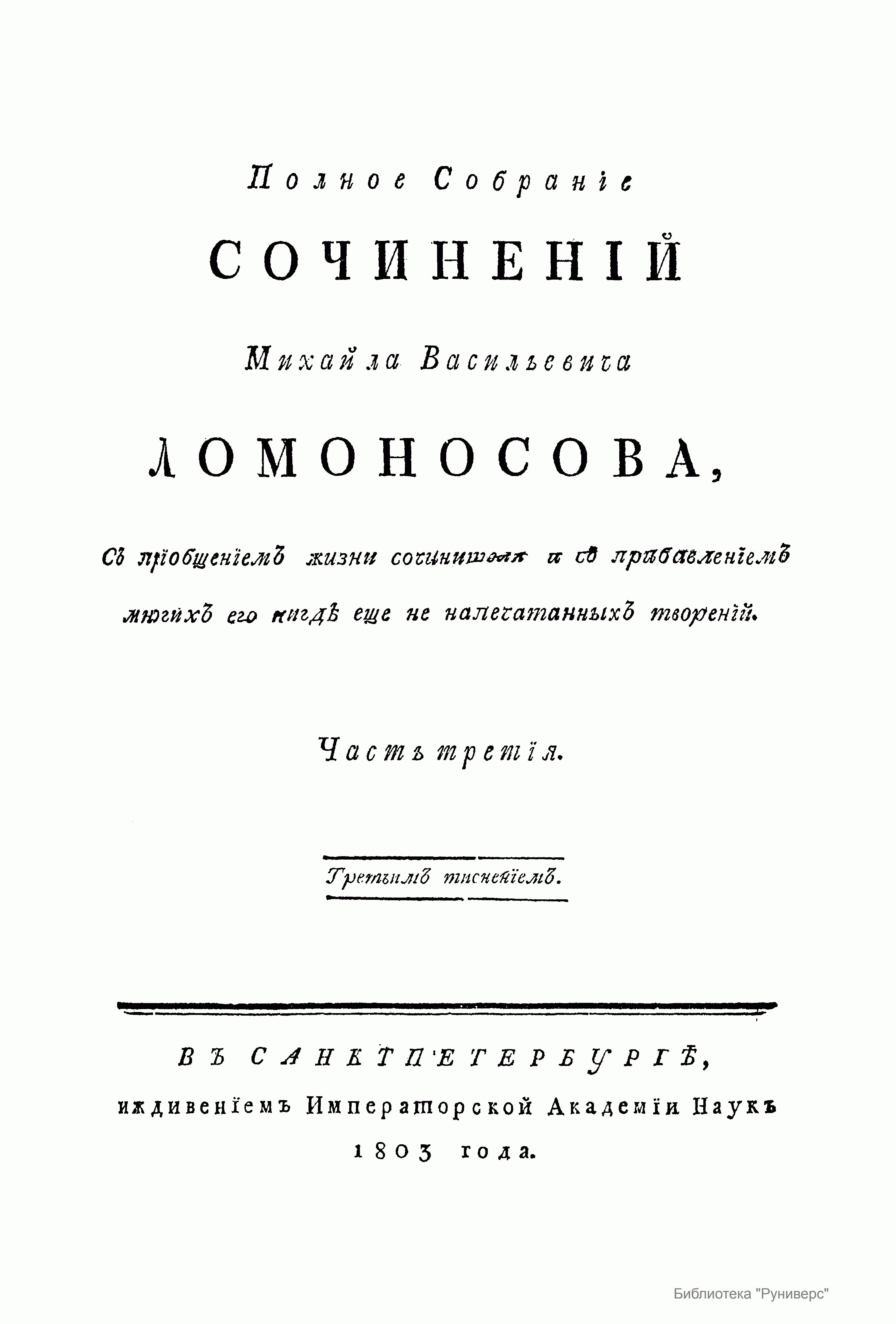 Полное Собранiе сочиненiй Михайла Васильевича Ломоносова, Съ прiобщенiемъ жизни сочинителя и съ прибавленiемъ многихъ его нигдѣ еще не напечатанныхъ творенiй. Часть третiя