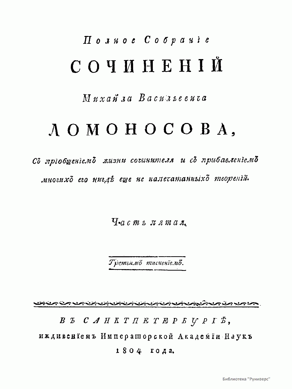 Полное Собранiе сочиненiй Михайла Васильевича Ломоносова, Съ прiобщенiемъ жизни сочинителя и съ прибавленiемъ многихъ его нигдѣ еще не напечатанныхъ творенiй. Часть пятая