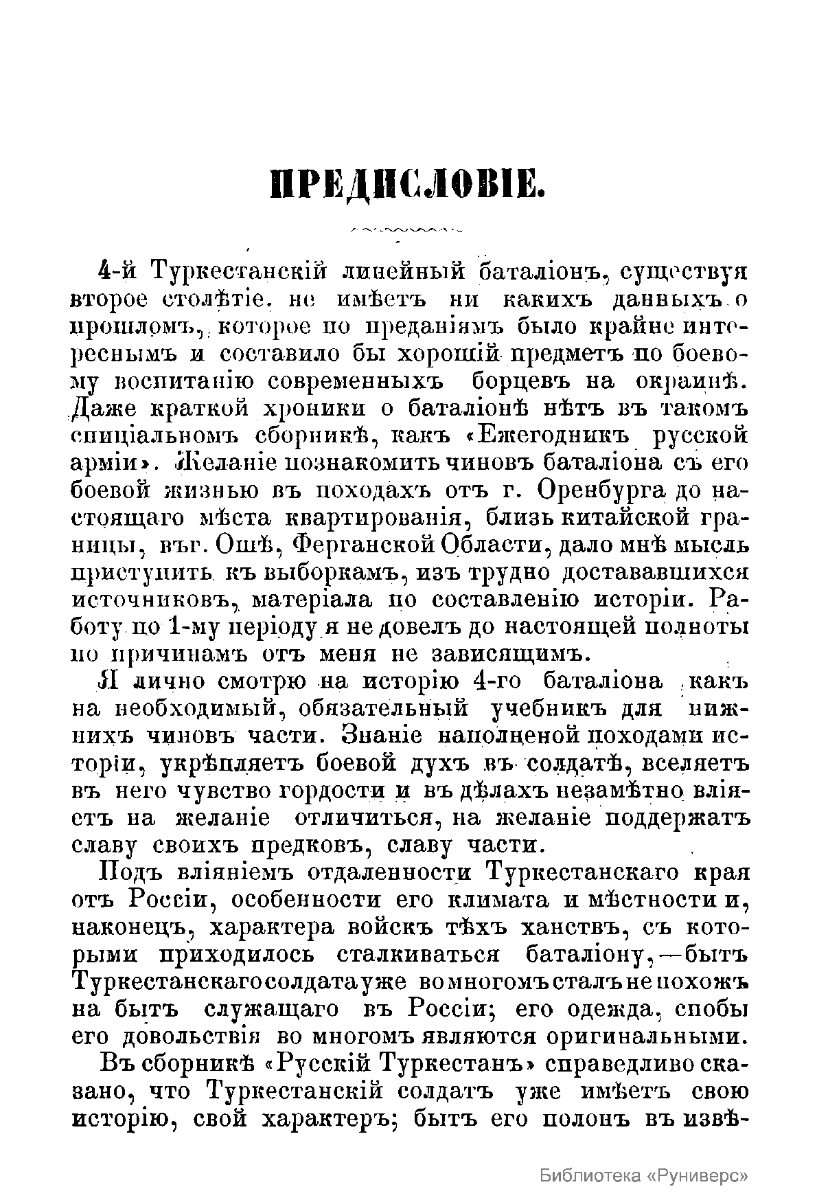 В предисловии к составленному военно-историческому очерка боевого пути 4-го Туркестанского линейного батальона его автор – поручик В.Н. Зайцев отмечает, что батальон, насчитывающий уже второе столетие своего существования, до сих пор «не имеет никаких данных о прошлом, которое по преданиям было крайне интересным и составило бы хороший предмет по боевому воспитанию современных борцов на окраине». «Желание познакомить чинов батальона с его боевой жизнью в походах от г. Оренбурга до настоящего места квартирования, близ китайской границы в г. Ош Ферганской области, дало мне мысль приступить к выборкам из трудно достававшихся источников и материалов по составлению истории». В данной книге вся боевая деятельность 4-го Туркестанского линейного батальона с момента его формирования до 1882 года разделена на три наиболее значительных периода. Первый период охватывает краткую хронику событий, связанных с формированием в августе 1771 года в оренбургской степи на базе гарнизона крепости Звериноголовск пограничного батальона в составе 5-ти рот и одной инвалидной команды. С этого момента и начинается история боевой деятельности батальона за 1771-1839 гг. Второй период боевой деятельности батальона включает события с 1839 по 1865 гг. описание участия батальона в Хивинском походе 1839-1840 гг., столкновениях с киргизами, сражении при Кум-суате, взятие крепостей Яны-Курган и Дин-Курган, взятие г. Туркестан, и, наконец, взятие Ташкента в июне 1865 года и основание русского Ташкента. Наконец, третий период охватывает 1865-1882 гг. В этой хронике описаны следующие события: поход через голодную степь к Джизаку, взятие Джизака в 1866 году, сражение под Самаркандом на Чупанатинских высотах, Хивинская экспедиция в 1873 году, штурм Андижана в 1873 году, покорение Кокандского ханства в 1875-1876 гг., а также участие в экспедициях в Алайские горы до кашгарской границы в 1876, 1877 и 1878 гг. Приложения к очерку включают списки командиров батальона и офицеров, служивших с 1839 по 1882 гг., а также список награжденных орденом святого Георгия и нижних чинов, награжденных знаком отличия Военного ордена, а также документы административно-хозяйственного содержания.
