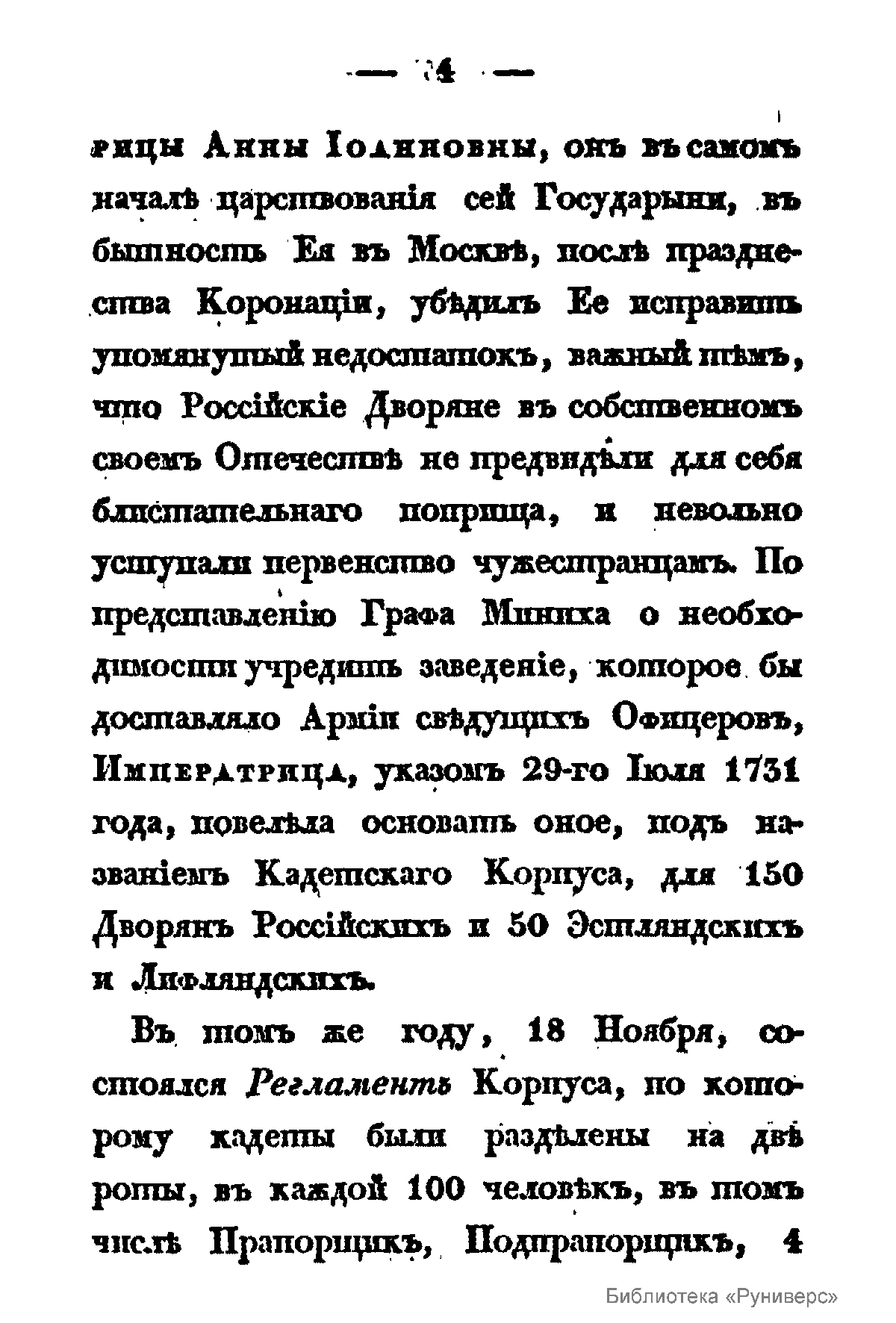 Очерк истории Первого кадетского корпуса, подготовленный в связи со 100-летием его создания, принадлежит перу одного из наиболее известных российских военных историков, выпускнику кадетского корпуса Александру Васильевичу Висковатову. Это издание удостоилось высокой оценки Николая I, что в дальнейшем повлияло на всё творчество военного историка. Кадетские корпуса своими корнями уходят в 1653 год. Именно тогда великий курфюрст Пруссии создал школу для несения детьми дворян воинской службы. Позже в 1715 году прусским королем Фридрихом Вильгельмом I была сформирована рота кадет, шефом которой был назначен будущий полководец четырехлетний Фридрих Великий. Сухопутный кадетский корпус в России был основан в царствование императрицы Анны Иоанновны по предложению одного из видных российских политиков и дипломатов, ближайшего соратника Петра Великого, бывшего генерал-прокурора Сената, графа П.И. Ягужинского, лично ознакомившегося с существовавшими в те годы кадетскими корпусами в Берлине и Копенгагене. Этот проект был поддержан военным министром генерал-фельдмаршалом графом Б.Х. Минихом, который составил план устройства «Корпуса кадет». 29 июля 1731 г. императрица подписала указ об учреждении в Санкт-Петербурге «Корпуса кадетов» и утвердила представленный Минихом план его устройства. Первым генерал-директором был также назначен сам фельдмаршал Миних. Особым указом было предложено дворянам присылать своих сыновей в корпус для получения здесь военного образования. Корпусу были отведены все постройки дворца на Васильевском острове, раннее принадлежавшего опальному князю А.Д. Меншикову, «с площадью земли ограниченной двумя с половиной верстами по периметру». Все имение было пожаловано корпусу в вечное владение. 17 февраля 1732 г. было положено начало занятиям в так называемой «Рыцарской Академии». В корпусе в то время было 56 кадет. В строевом и административном отношении корпус делился на гренадерскую, мушкетерскую и конную роты. Корпусу было пожаловано знамя с инициалами императрицы. В начале царствования Елизаветы Петровны, корпус получил наименование «Сухопутного Шляхетного Кадетского Корпуса», в отличие от учреждавшегося тогда, из бывшей еще при Петре Великом школы навигацких наук, Морского кадетского корпуса. В царствование Елизаветы Петровны, в стенах корпуса прошли обучение такие выдающиеся полководцы и государственные деятели как генерал-фельдмаршал Румянцев-Задунайский, генералиссимус Суворов-Рымникский князь Италийский, генерал-фельдмаршалы князь Прозоровский и граф Каменский, генерал Мелисино, будущий первый; русский драматург Сумароков, поэт Херасков, писатель Озеров и многие другие. При Екатерине Великой, в корпусе были произведены значительные реформы. В 1766 г. был введен новый устав, составленный И.И. Бецким. Корпус кадет, принятый императрицей под особое покровительство, стал именоваться «Императорским Шляхетским сухопутным кадетским корпусом». По новому уставу обучение и воспитание в корпусе должно было начинаться с 6-ти летнего возраста и продолжаться в течение 15 лет. Все кадеты делились на 5 возрастов, при чем первые три именовались младшим классом, затем средним и старшим классами, а 4-й и 5-й – военными возрастами, с пребыванием в каждом также по 3 года. Деление на роты было сохранено для военных возра